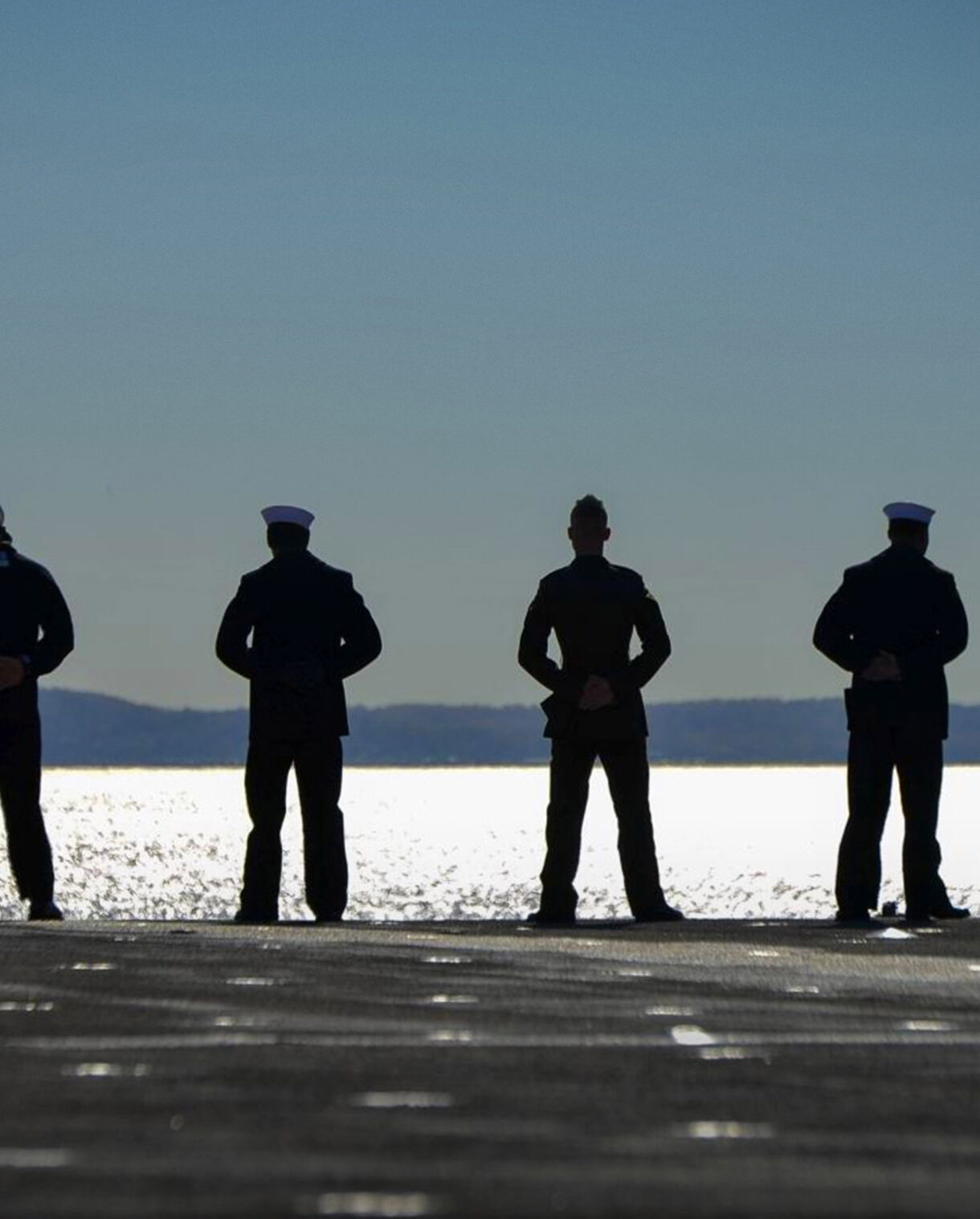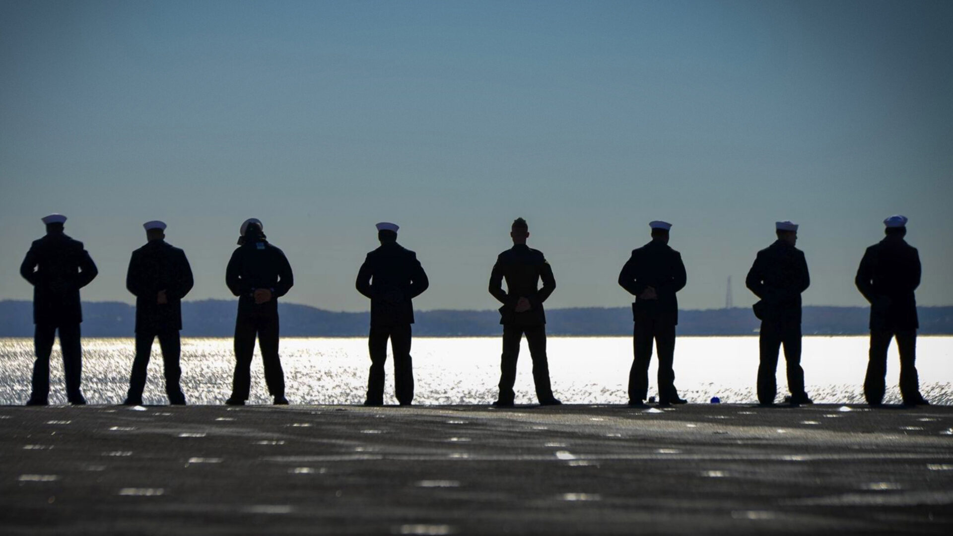 A majestic 4K wallpaper showcasing eight Amphibious Assault Ship USS Iwo Jima sailors standing in silhouette on the deck, overlooking the Hudson River. The golden shimmer of the river, backlighting their stoic forms and crisp white sailor caps against the vast expanse of the sky, creates a powerful and contemplative scene.