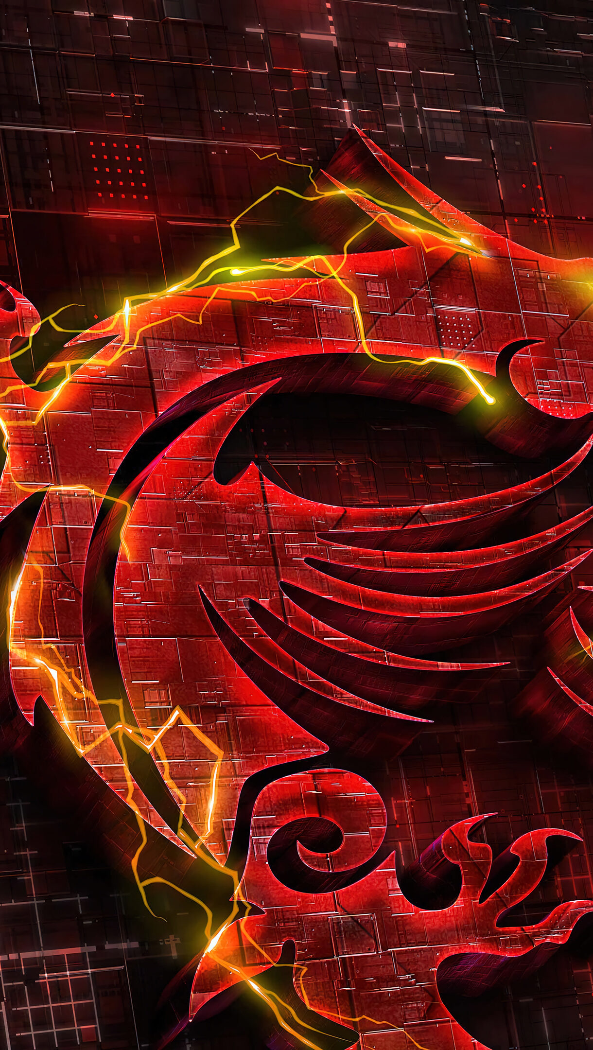 An electrifying 4K wallpaper featuring the bold red MSI Dragon logo set against a dark, intricate tech-inspired background. Vivid yellow-orange lightning crackles around the dragon's silhouette, illuminating its detailed texture and adding a dynamic, powerful intensity to the scene.