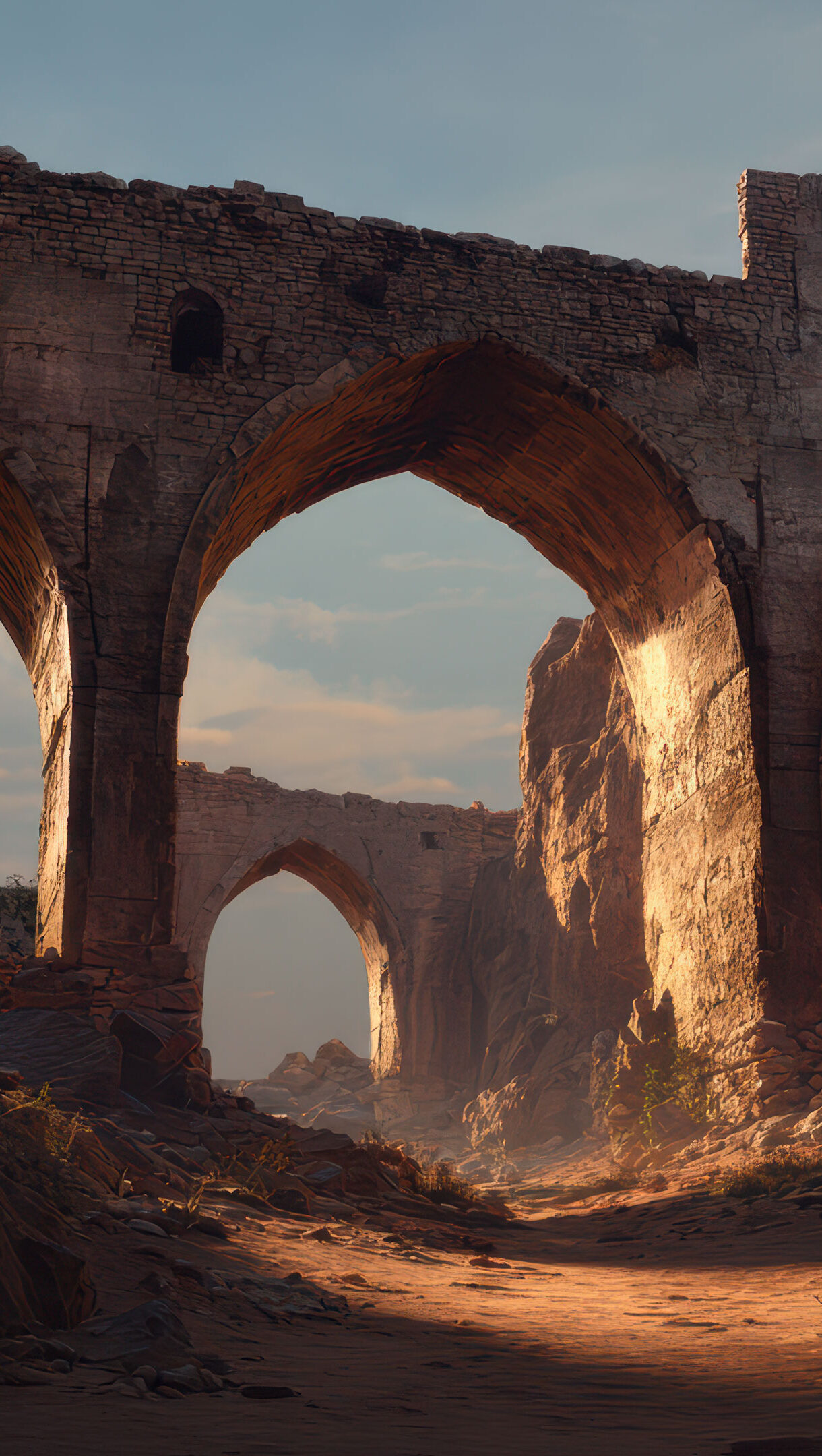 A majestic 4K wallpaper of ancient desert ruins featuring multiple grand archways nestled within a vast, sun-baked canyon. The warm, golden light of dawn or dusk beautifully illuminates the weathered stone structures and textured desert floor, showcasing the intricate detail of this digital art.