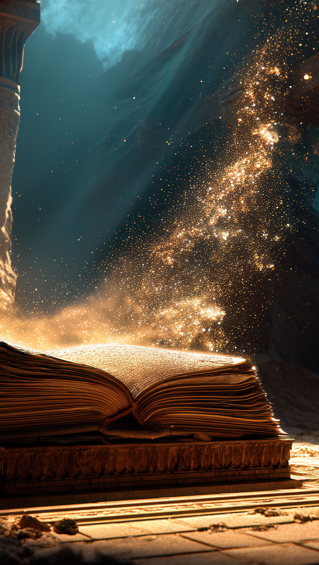 An ancient, weathered book lies open, its pages aglow with an ethereal, warm light emanating from intricate, illuminated illustrations and text, set against a dark, mysterious background.