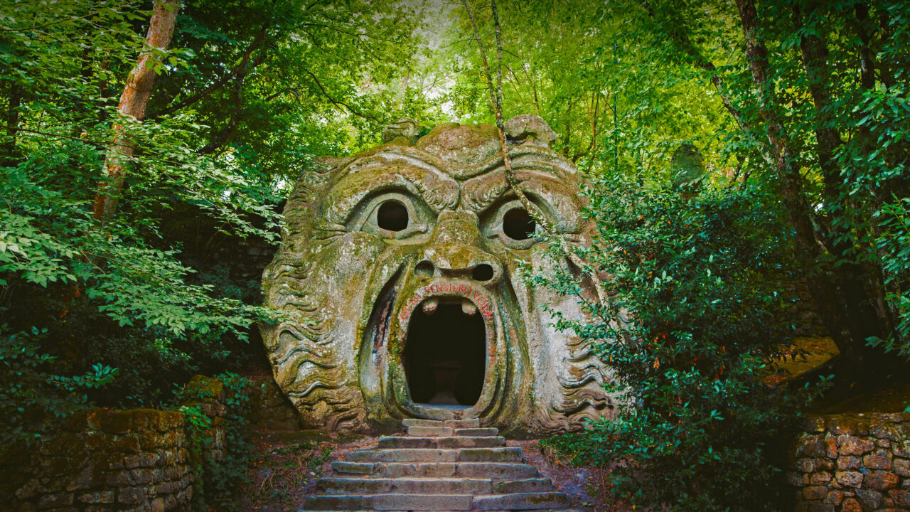 A haunting 4K wallpaper featuring the ancient Orcus stone face sculpture, deeply carved and nestled within the verdant, wild Gardens of Bomarzo, Italy. The sculpture's immense, weathered stone face, with its wide, cavernous mouth forming a passageway, emanates an ancient, powerful emotion amidst the surrounding dense green foliage.