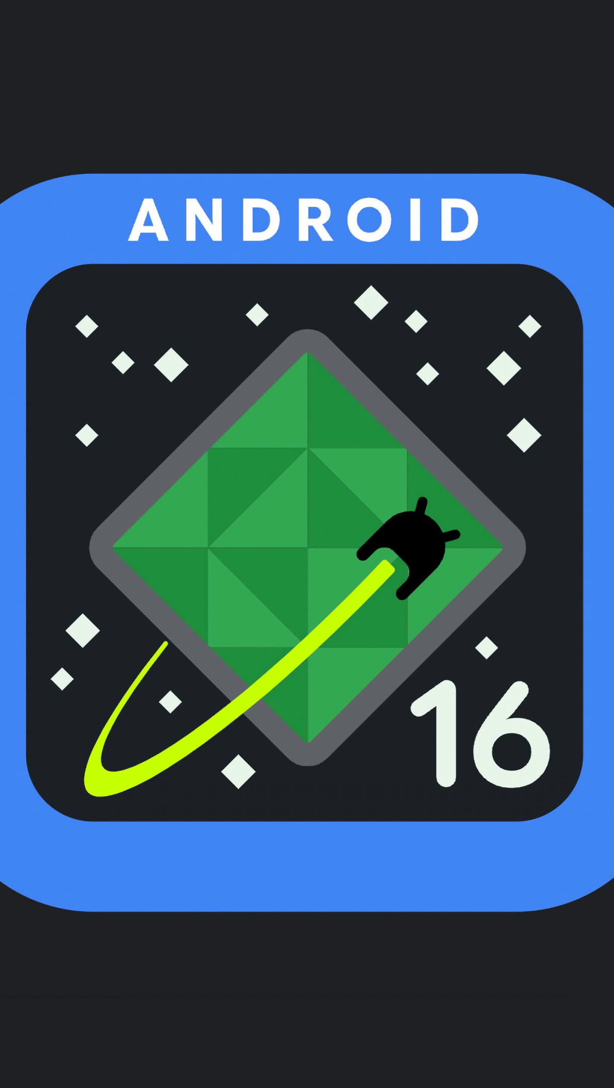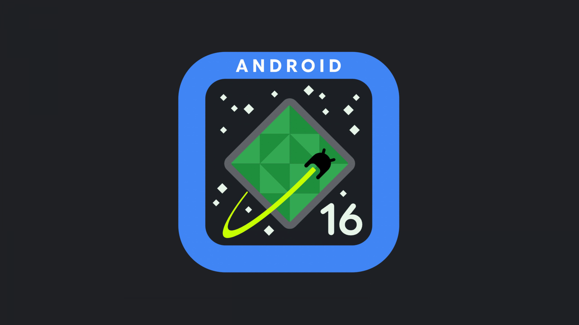 Android 16 logo: A black stylized spaceship with a bright green trail flies over a faceted green diamond shape, resembling a planet or asteroid, against a dark starry background. The scene is enclosed in a blue rounded square border with ANDROID at the top and 16 at the bottom right.