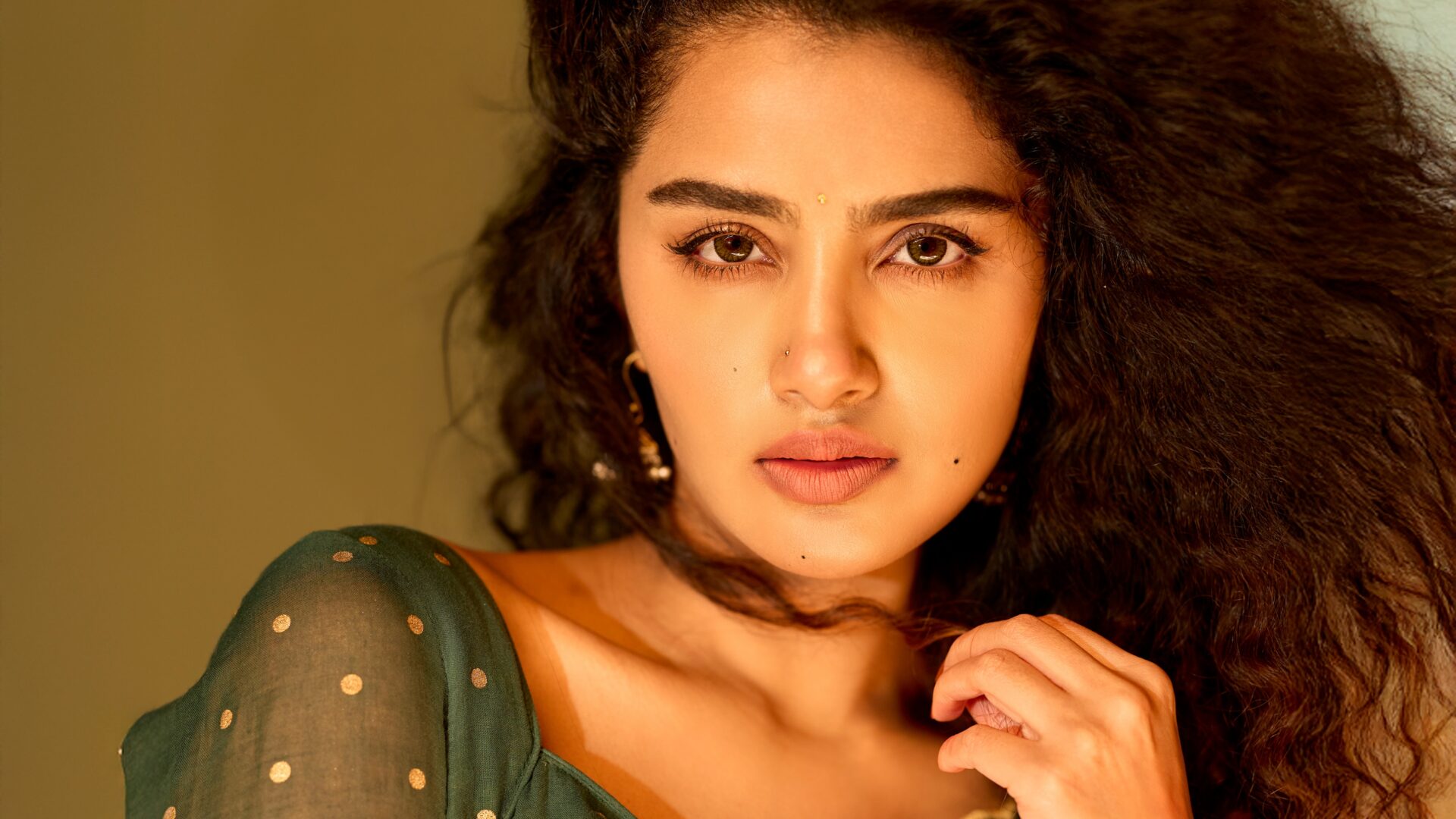 A captivating 4K wallpaper of Anupama Parameswaran in a close-up portrait, looking directly at the viewer with a gentle gaze against a warm, soft background. Her dark, voluminous curly hair contrasts beautifully with her glowing skin, enhanced by warm, soft lighting that highlights her serene expression and the delicate details of her eyes and traditional nose stud.