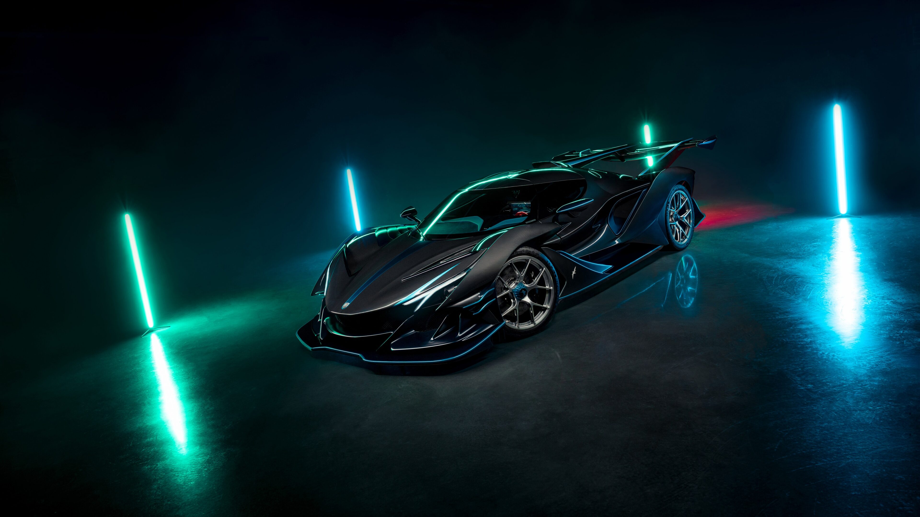A breathtaking 4K wallpaper showcases the formidable Apollo Intensa Emozione 'Ocean Dragon' hypercar, dramatically posed in a dark, neon-lit environment. Its sculpted, dark carbon fiber body is vividly outlined by electric blue and neon green lights, evoking the sleek, powerful essence of an aquatic predator ready to surge forward.