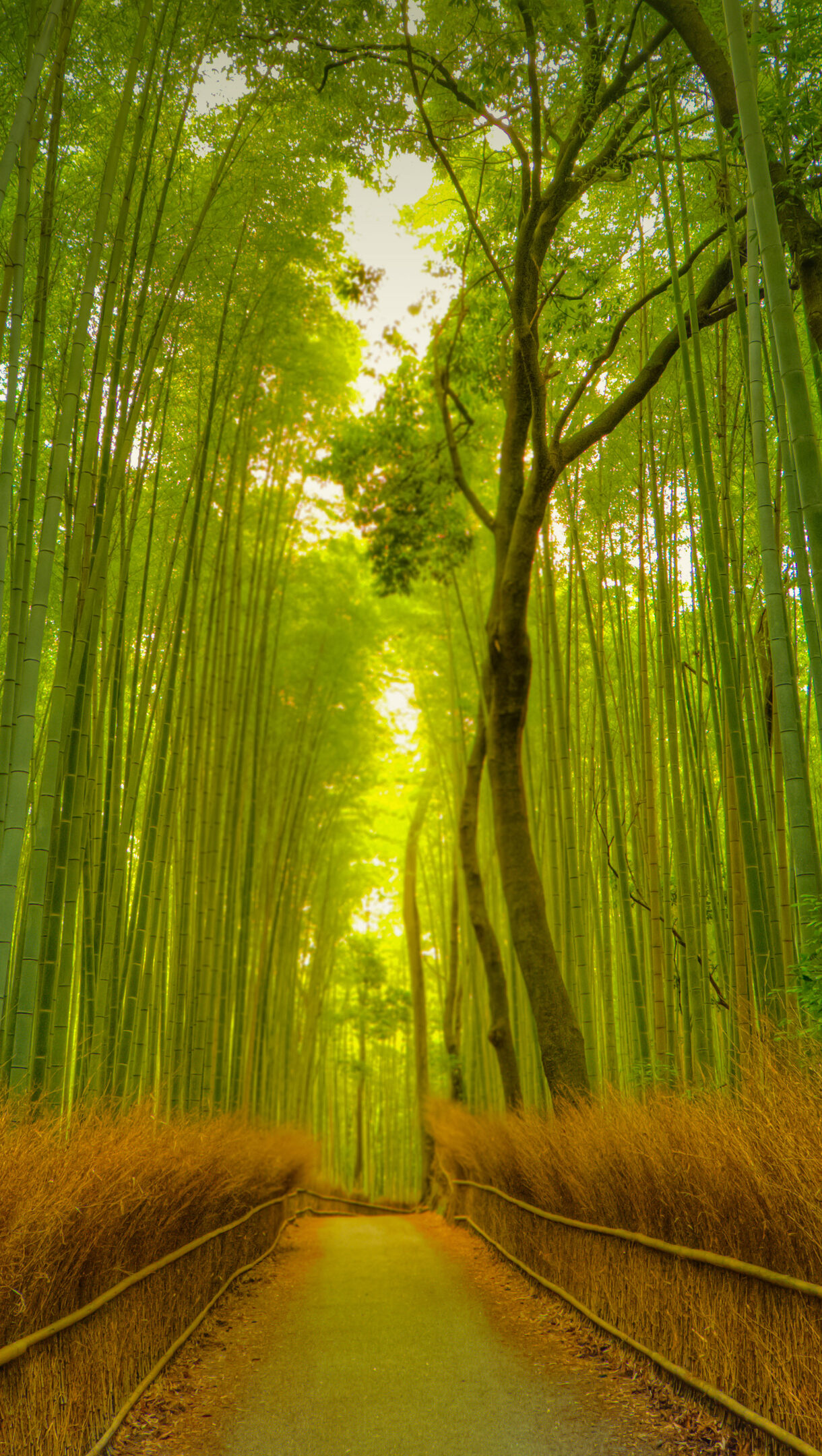A breathtaking 4K wallpaper showcasing the iconic Arashiyama Bamboo Grove in Kyoto, Japan, with a winding footpath leading through its towering green stalks. Sunlight streams through the dense canopy, illuminating the path and casting an ethereal glow over the vibrant bamboo and rustic dried bamboo fences.