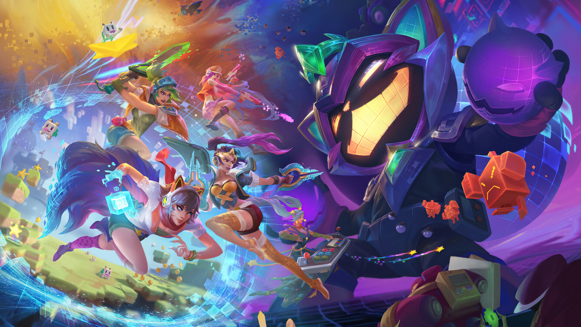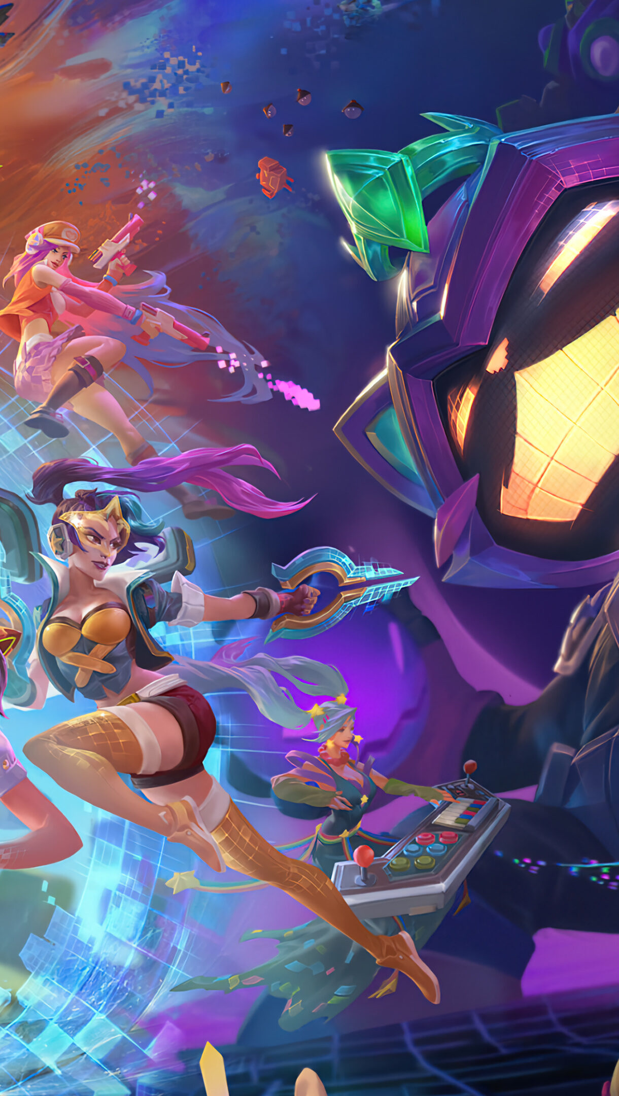 A captivating 4K wallpaper featuring the Arcade skins of Ziggs, Ahri, Kaisa, Riven, Miss Fortune, and Sona from League of Legends Wild Rift. These popular champions are depicted in their vibrant and stylish Arcade outfits, ready for action in the game. Simply click the download button to bring this masterpiece to life on your screen as a desktop wallpaper or save it for later in your picture collection.