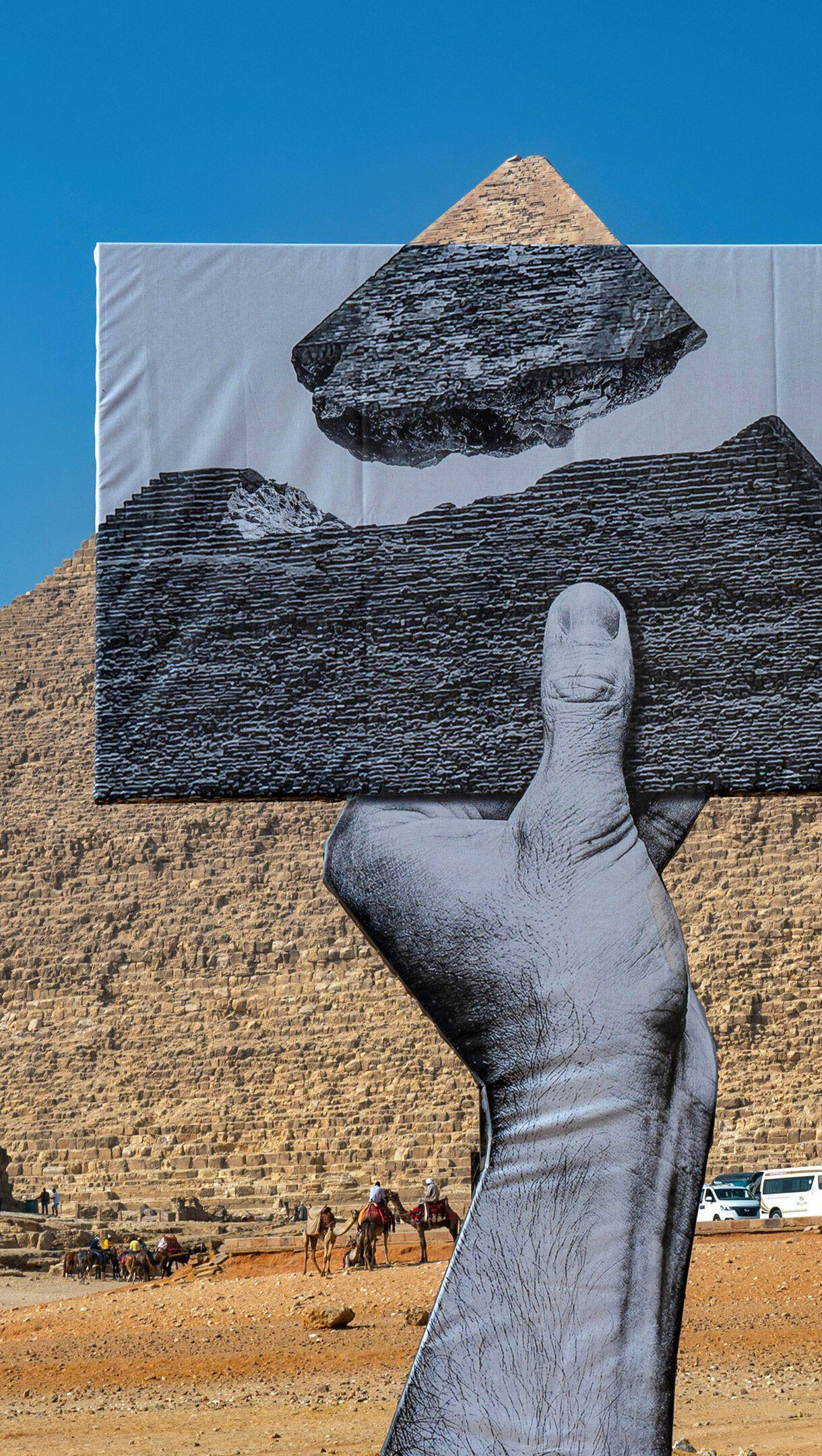A monumental 4K wallpaper showcasing Artist JR's Pyramid Installation in the Giza desert, where a large-scale black and white cutout hand appears to hold a photographic fragment of a pyramid in front of the actual Great Pyramid of Giza. The vibrant blue sky and warm desert tones contrast sharply with the monochromatic art, creating a thought-provoking blend of ancient wonder and contemporary artistic expression.