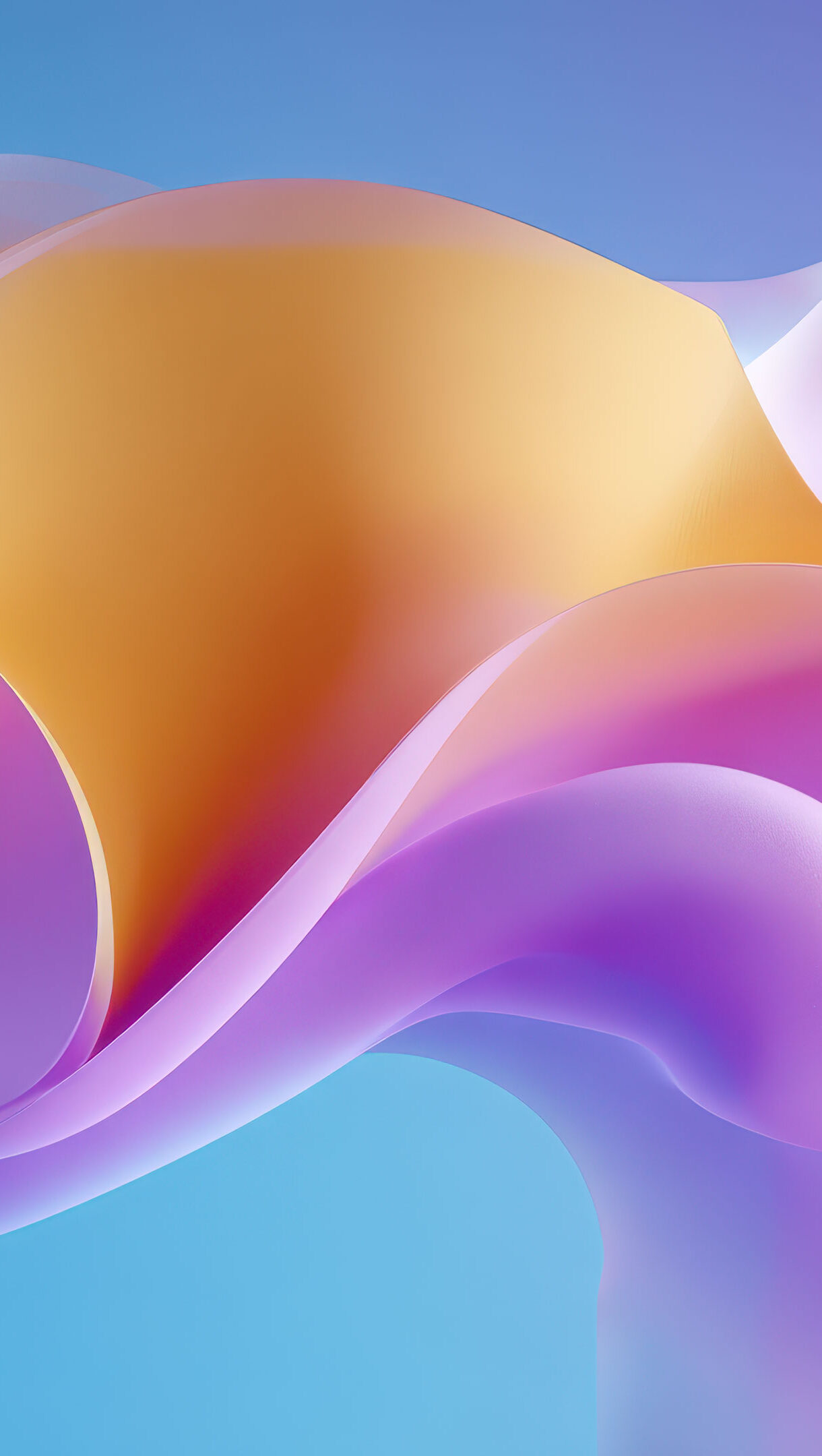 A vibrant 4K wallpaper showcases flowing, translucent ribbons of orange, purple, and pink against a soft blue and violet gradient background. The ethereal interplay of light and shadow creates an iridescent effect, enhancing the smooth, dreamlike texture of the abstract forms.