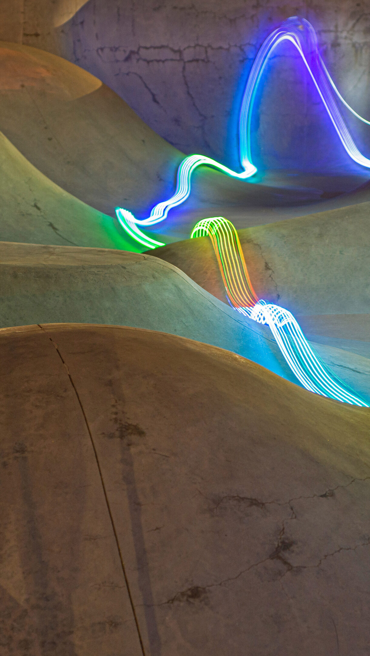 An electrifying 4K wallpaper showcasing the Arvada Skatepark in Arvada, Colorado, with its dynamic arrangement of concrete ramps and bowls. Vibrant, multi-colored light trails streak across its undulating surfaces, creating a sense of energetic movement and transforming the concrete landscape.