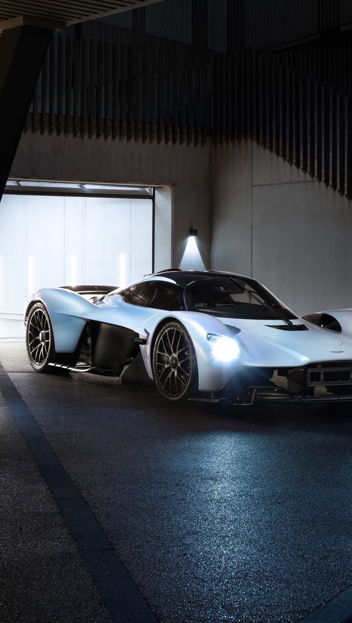 An electrifying 4K wallpaper showcasing an Aston Martin Valkyrie Hybrid supercar parked at night in front of a modern building with illuminated garage doors. Its powerful headlights cut through the darkness, casting a bright glow on the wet asphalt and emphasizing the vehicle's futuristic, high-performance aesthetic.