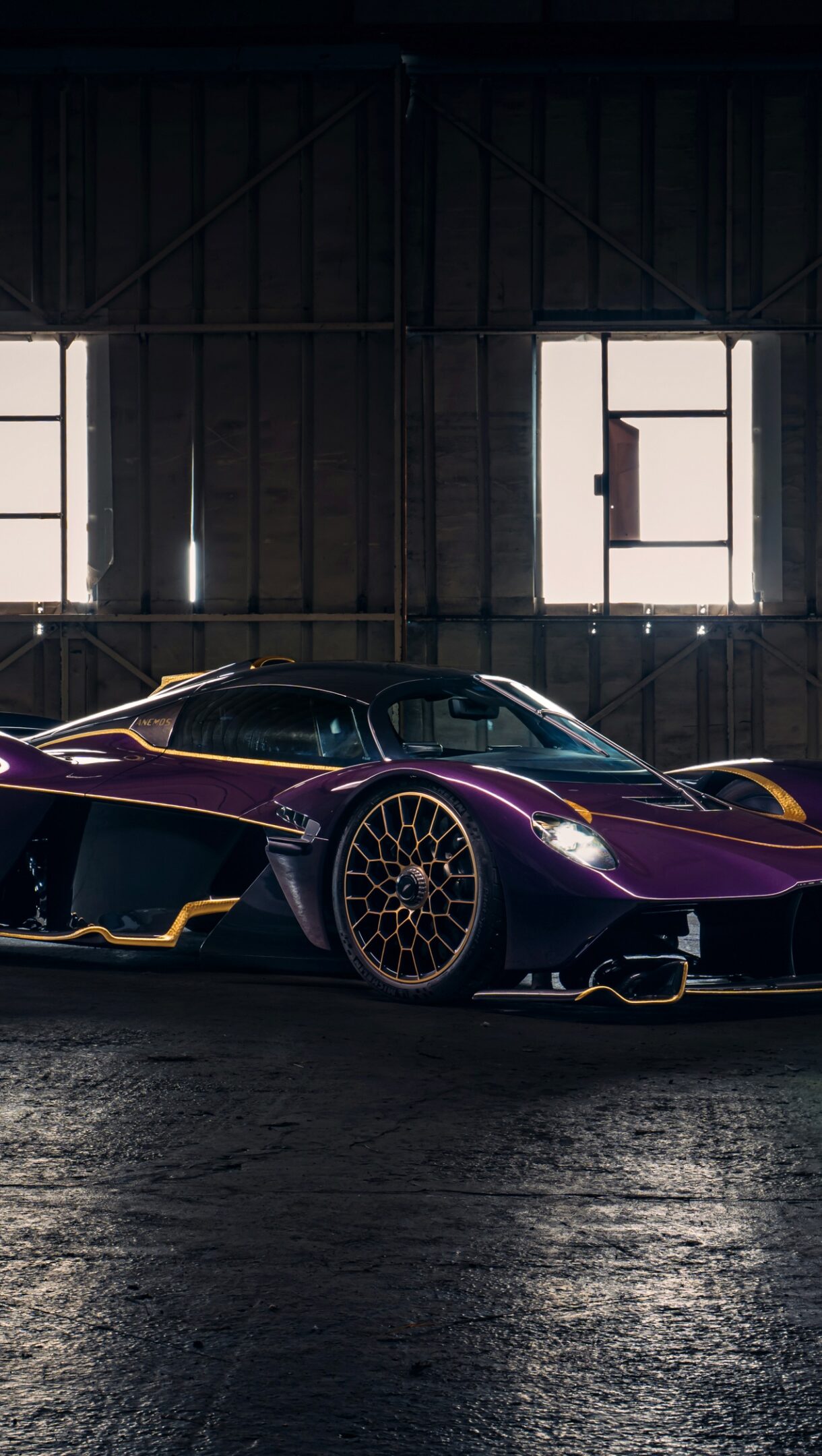 An electrifying 4K wallpaper showcases a vibrant purple and gold Aston Martin Valkyrie hypercar parked centrally within a vast, dimly lit hangar. Its sleek bodywork, highlighted by subtle light filtering through the large windows behind, reflects brilliant gold accents that amplify its luxurious and powerful presence.