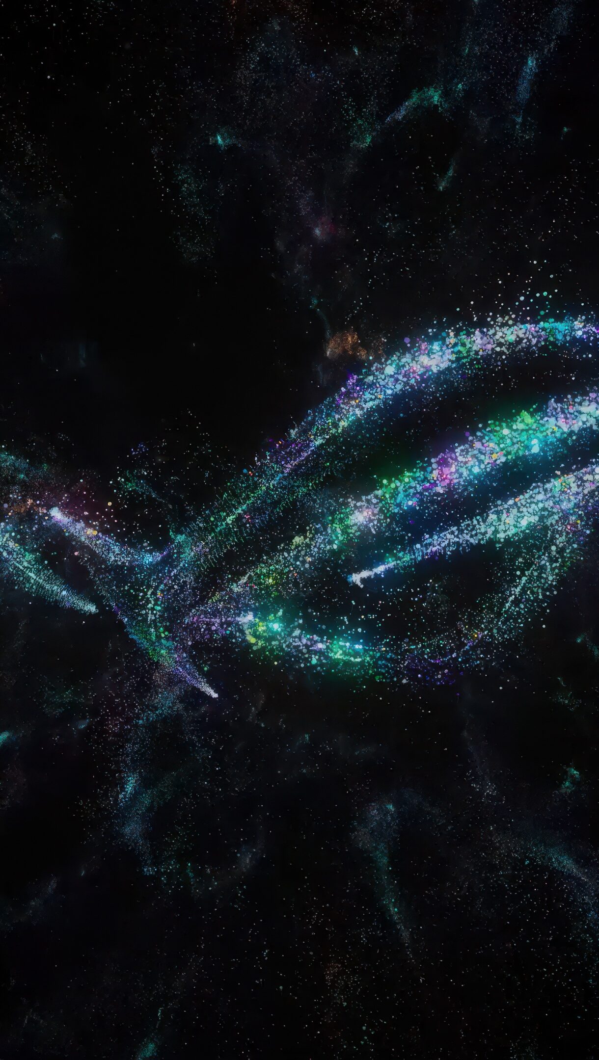 A captivating 4K wallpaper features the iconic Asus ROG logo dynamically formed from a swirling mass of vibrant, glowing particles set against a deep black, cosmic background. The interplay of luminous teal, purple, and green particles generates an ethereal, high-energy effect, defining a futuristic and powerful mood.