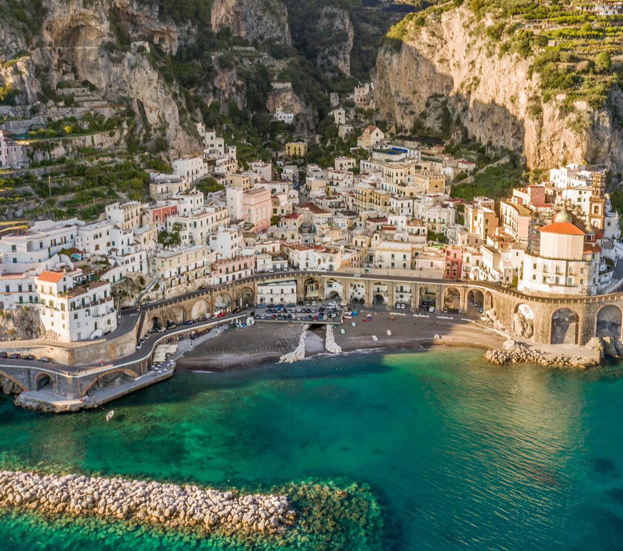 An idyllic 4K wallpaper captures an aerial view of Atrani, a picturesque coastal town in Italy's Amalfi Coast, nestled dramatically at the base of towering cliffs. Golden hour sunlight bathes the pastel buildings and winding road, creating a warm glow that contrasts with the sparkling, clear turquoise waters of the Mediterranean Sea.