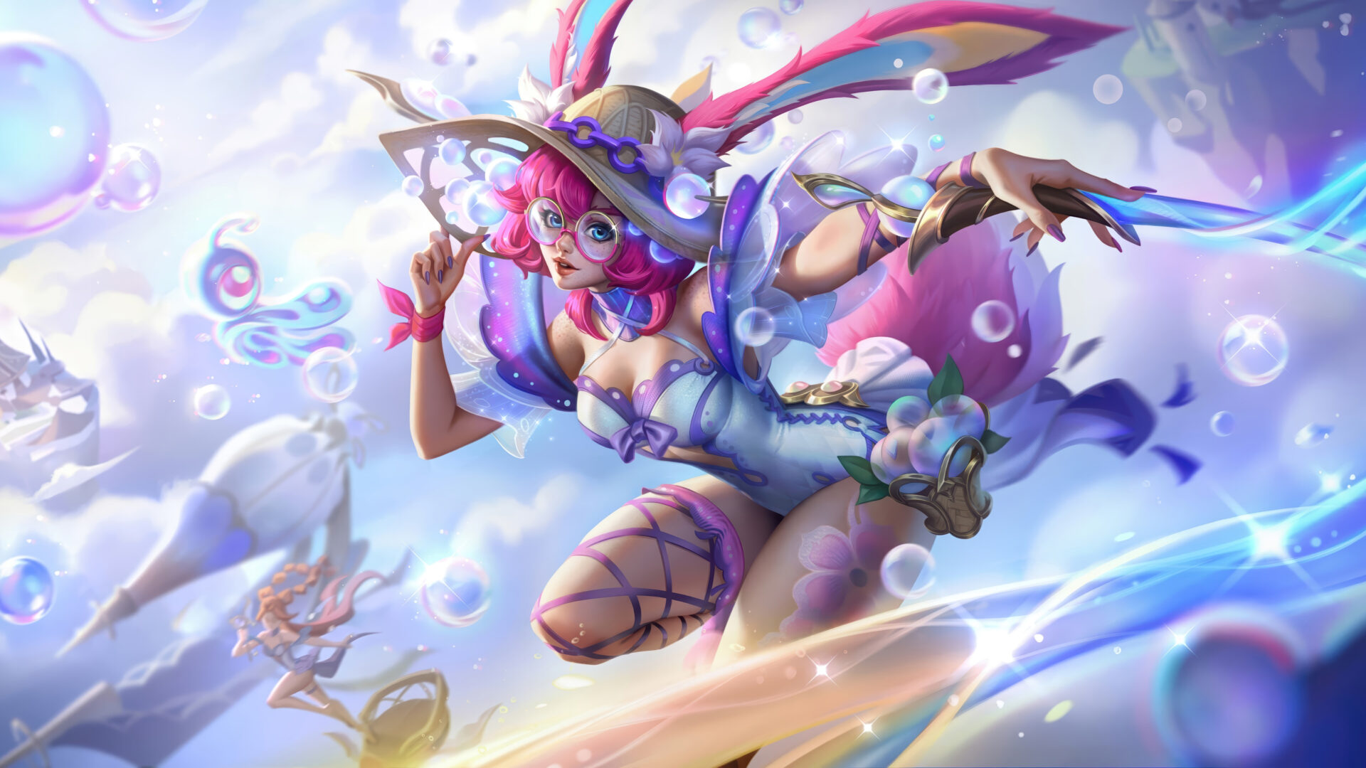 A vibrant 4K wallpaper showcasing Aurora in her Summer Party skin, leaping dynamically amidst a bright, bubbly sky with hints of distant whimsical architecture. Iridescent bubbles and a glowing blue energy stream surround her, emphasizing the playful, radiant energy of the scene.