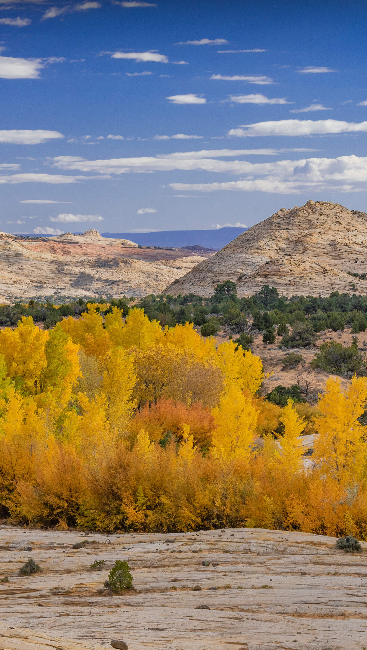 A breathtaking 4K wallpaper of autumn cottonwood trees lining a stream bed within the expansive Grand Staircase-Escalante National Monument in Utah. Their vivid golden and orange leaves glow brilliantly against the sun-drenched, layered sandstone hills and the crisp blue sky dotted with scattered white clouds, evoking a serene desert autumn.