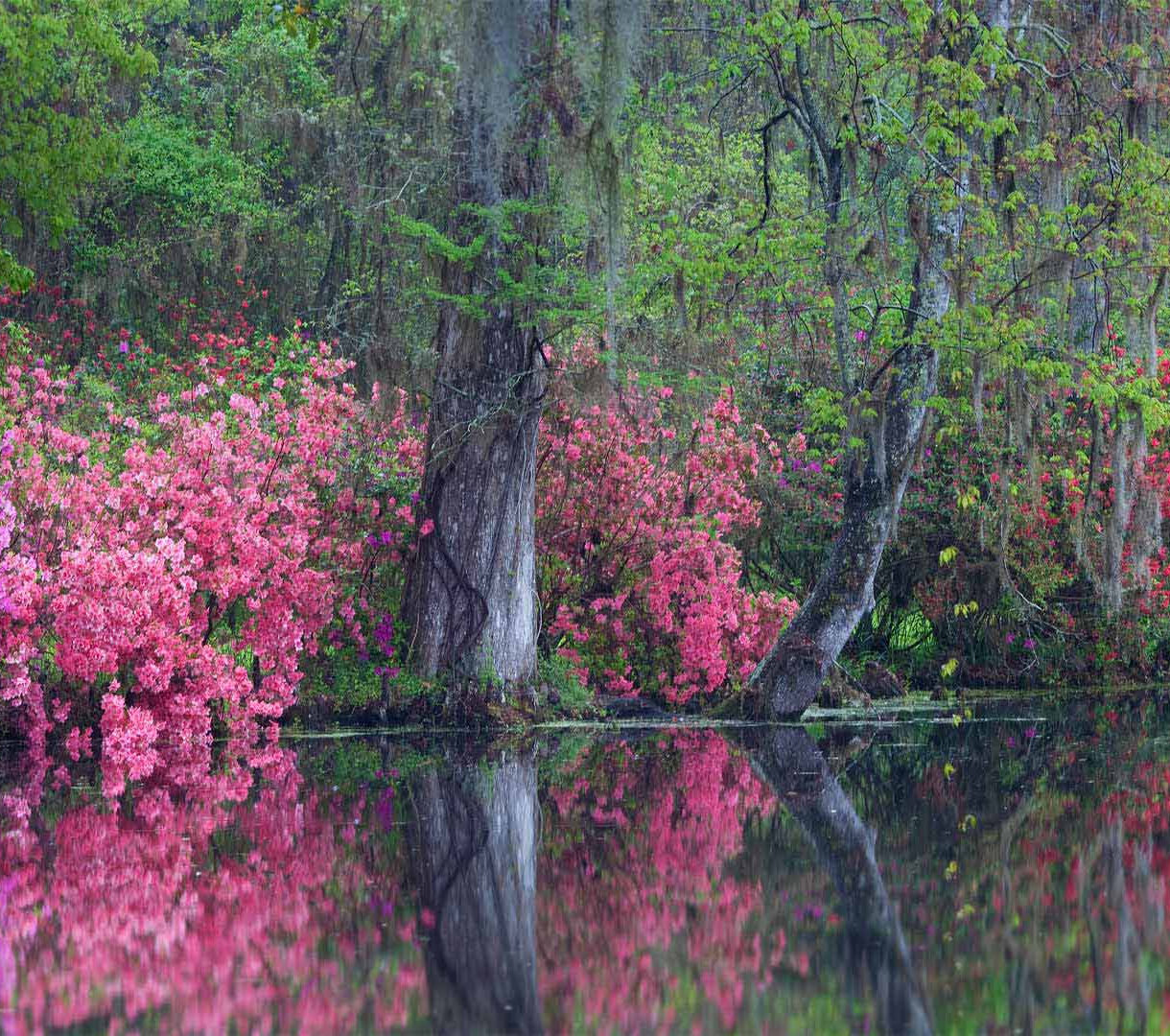An enchanting 4K wallpaper displaying vibrant Azaleas in full bloom lining the serene waters of Magnolia Plantation Gardens. The lush pinks and reds of the blossoms are mirrored perfectly in the dark, still water, creating a tranquil and symmetrical scene.