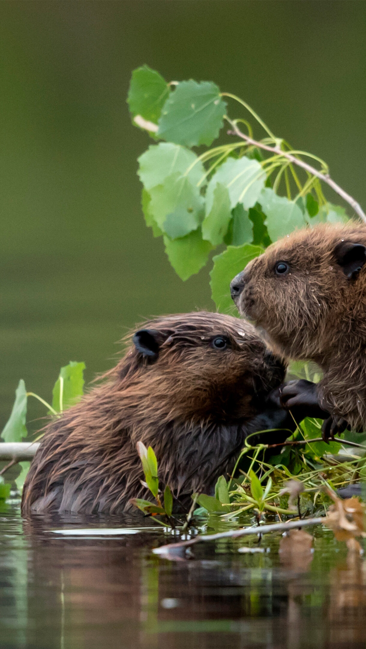 An enchanting 4K wallpaper presents two wet, brown baby Eurasian beavers nestled amongst green foliage at the edge of calm water in the Finnish wilderness. Their intimate nuzzle, framed by shimmering water and vibrant green leaves, creates a tender and serene moment in the wild.