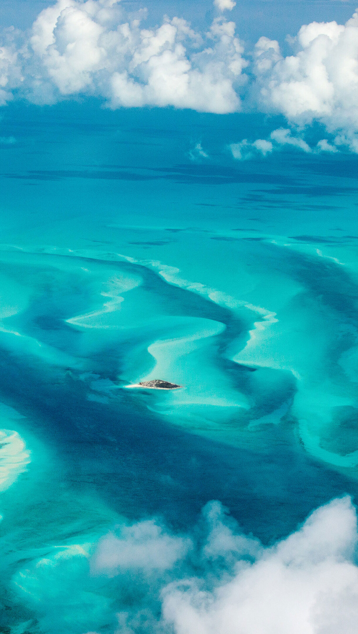 A breathtaking 4K wallpaper showcasing the serene, clear turquoise waters of the Bahamas from an aerial perspective. Intricate patterns of light and dark blue ocean depths swirl around two small lush islands, framed by soft white clouds, evoking a tranquil and expansive natural beauty.