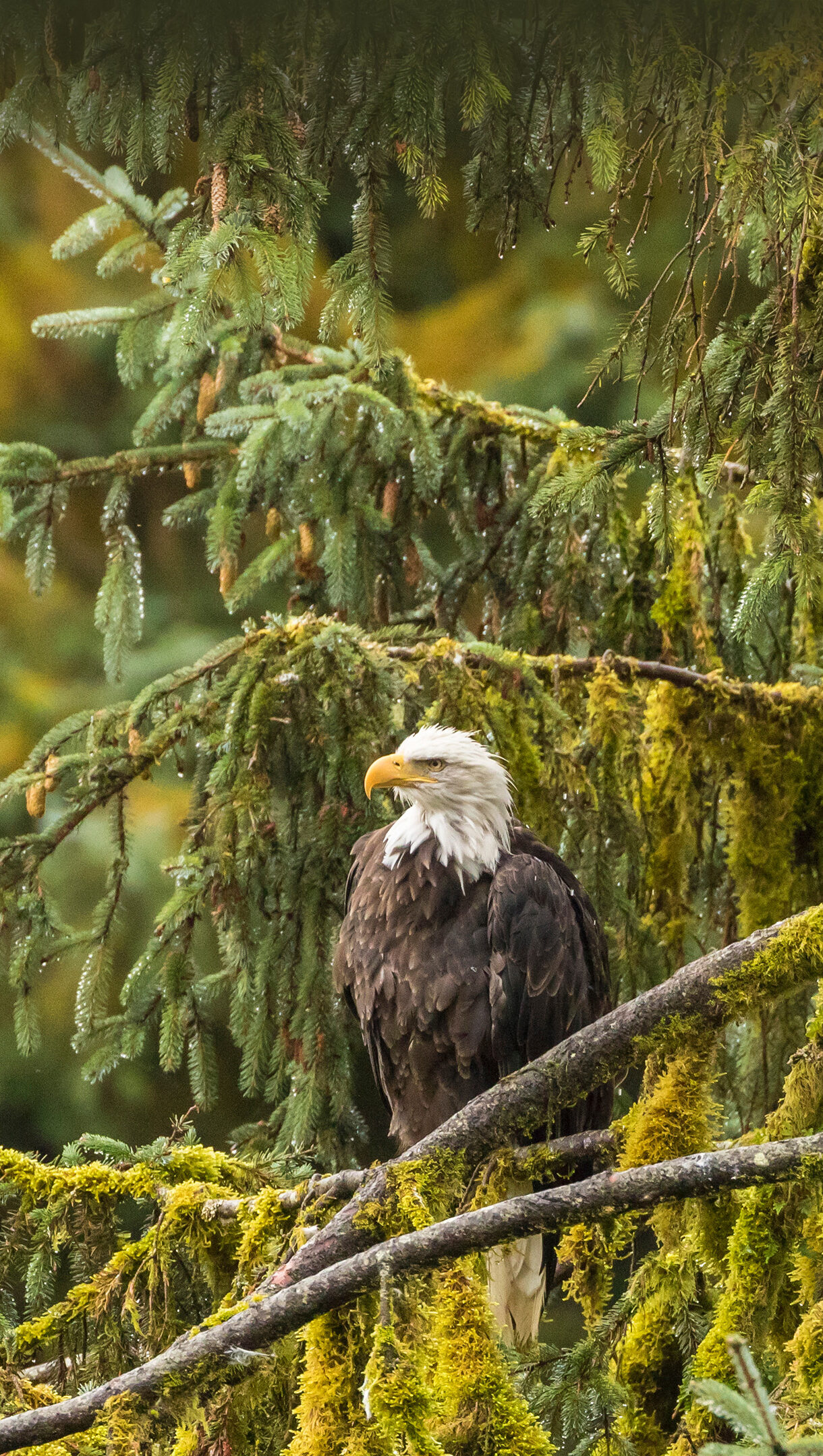 An immersive 4K wallpaper portraying a regal Bald Eagle perched amidst the dense, mossy branches of a towering evergreen in Alaska's Tongass National Forest. The intricate tapestry of vibrant green and yellow moss, glistening with moisture on every branch, enhances the forest's lush, wild ambiance.