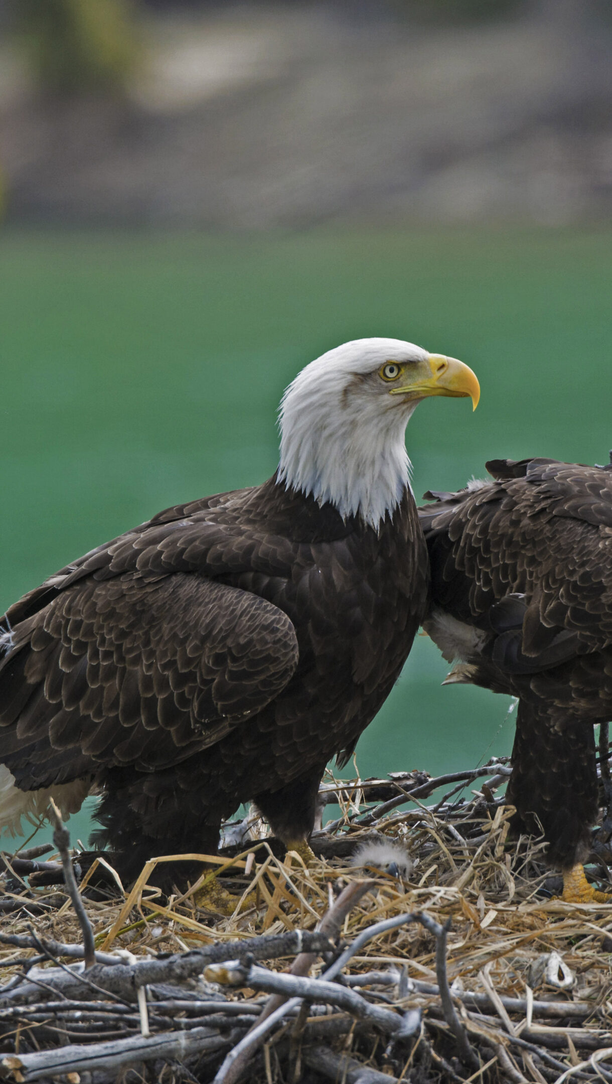 A powerful 4K wallpaper captures a majestic bald eagle pair with their fluffy chick nestled securely in a large stick nest overlooking the serene Yukon River. The intense gazes of the adult eagles convey protective vigilance, set against the striking turquoise-green water and framed by soft, blurred lime-green foliage.