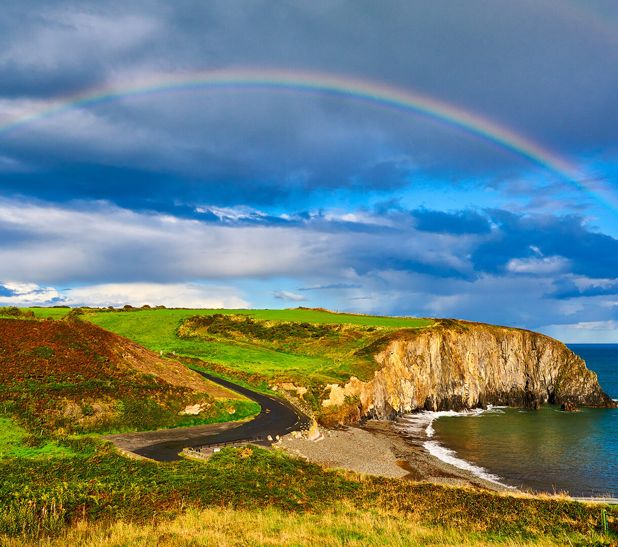A magical 4K wallpaper of Ballyvooney Cove in the Copper Coast Geopark, where lush green hills meet dramatic ocean cliffs and a winding road. A vibrant double rainbow beautifully spans the dramatic sky and deep blue ocean, casting its colorful arc over the rugged cliffs of the cove.