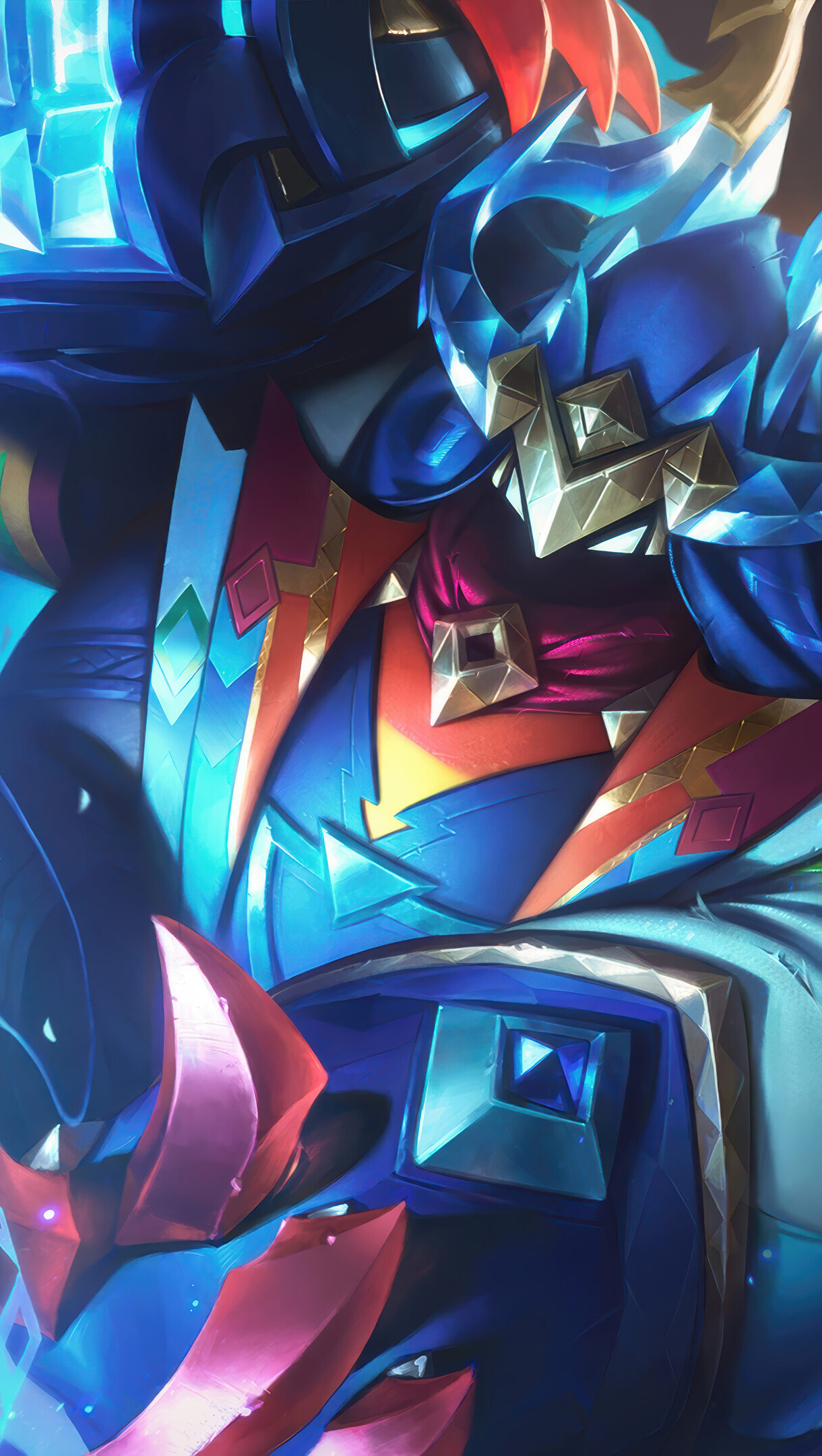 A vibrant 4K wallpaper showcasing Bard in his Mystical Herald Skin from LoL Wild Rift, depicted amidst a powerful burst of glowing blue-cyan energy within a dark, abstract magical environment. The splash art highlights the intricate crystalline details of his armor and the dynamic, geometric magical effects radiating around him, creating an aura of intense mystical power.