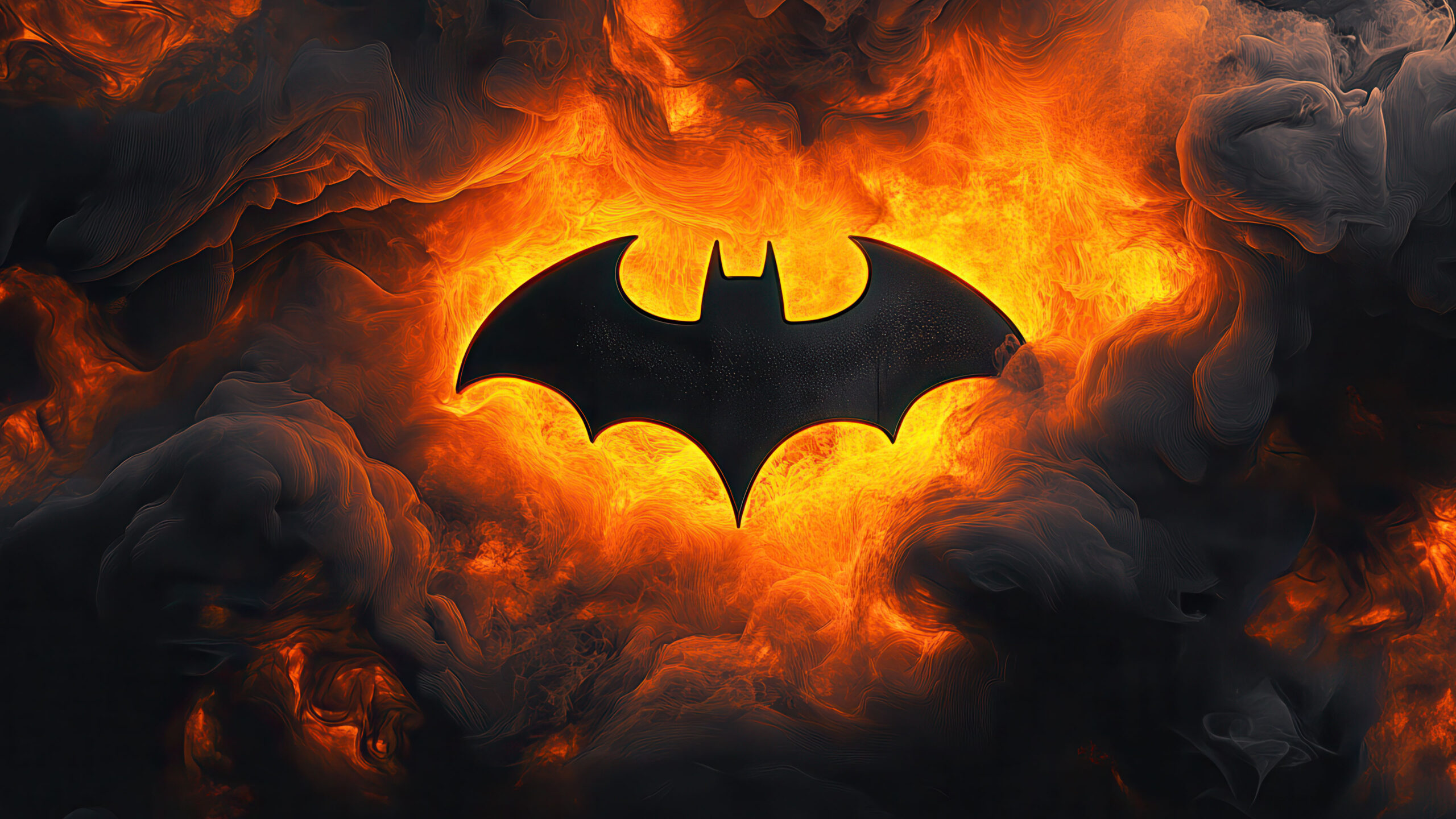 A stunning 4K wallpaper featuring the iconic Batman logo engulfed in flames. The fiery design creates an intense and dramatic visual effect, perfect for a bold and striking desktop or mobile background.