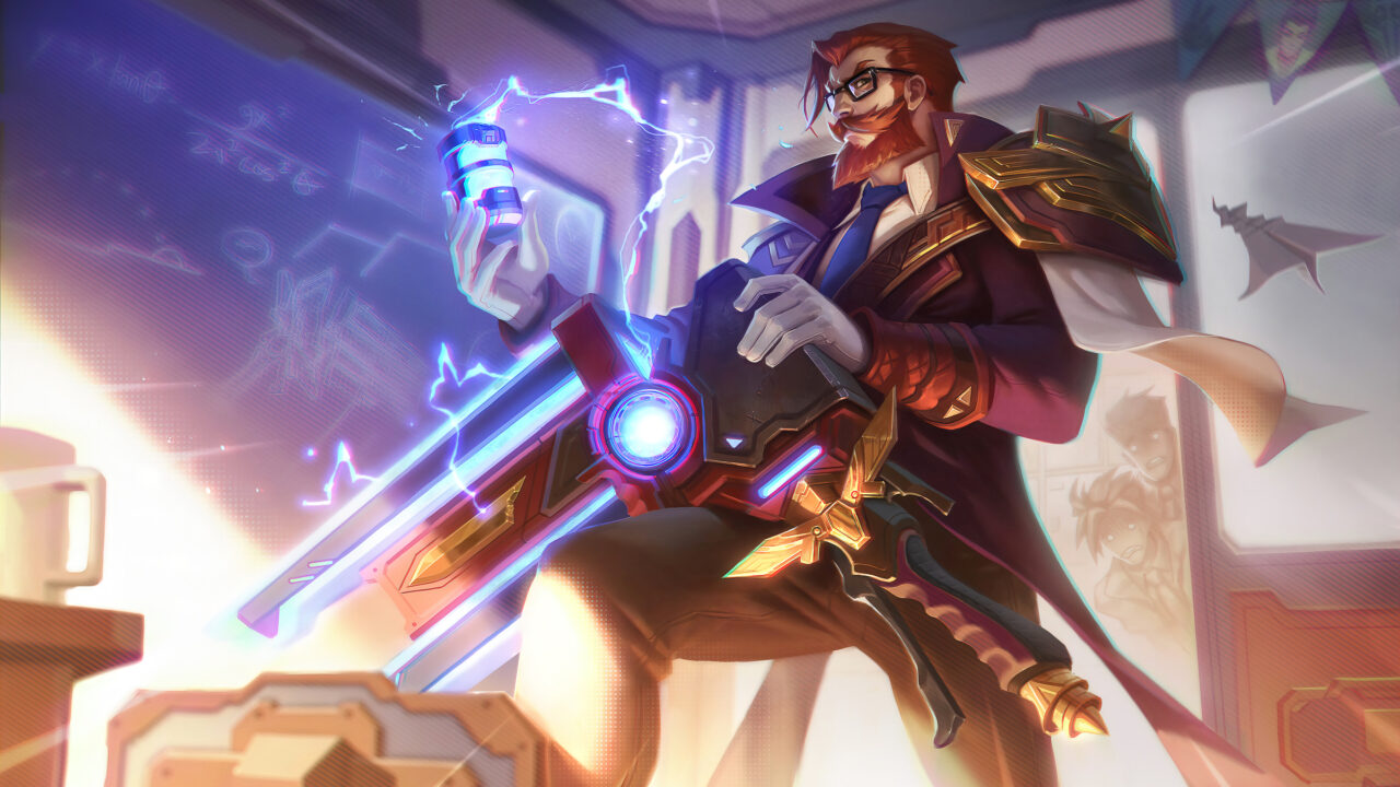 A captivating 4K wallpaper featuring the Battle Academia Graves skin from League of Legends Wild Rift. Graves, a renowned marksman, is showcased in his Battle Academia attire, wielding his signature shotgun with determination. Simply click the download button to bring this masterpiece to life on your screen as a desktop wallpaper or save it for later in your picture collection.