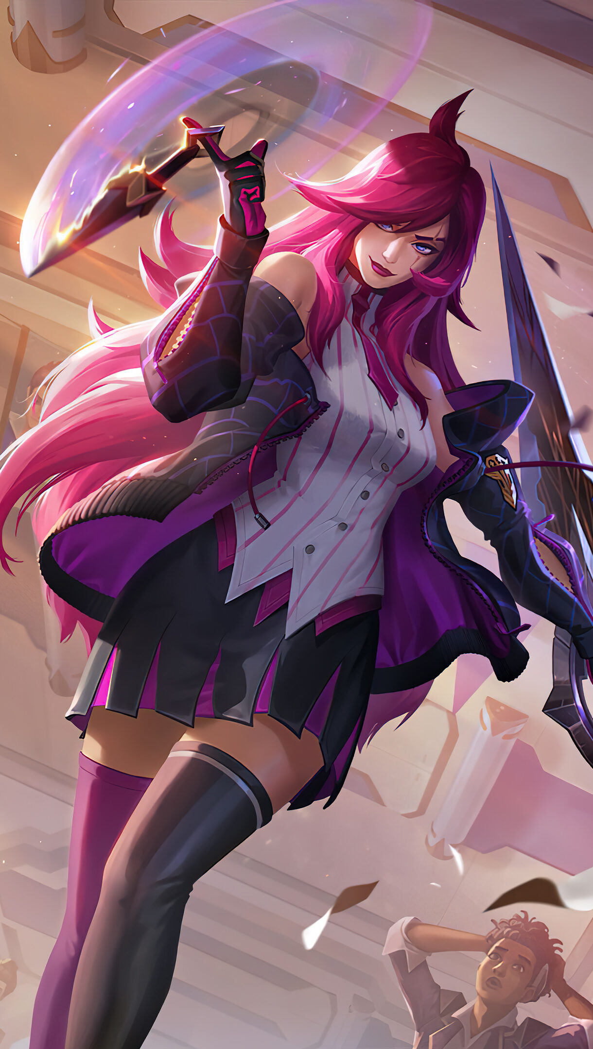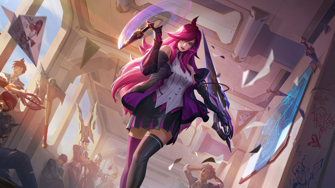A captivating 4K wallpaper featuring the Battle Academia Katarina Level 1 skin from League of Legends. Katarina, a fierce and skilled assassin, is showcased in her stunning Battle Academia attire, ready for intense battles in the world of League of Legends. Simply click the download button to bring this masterpiece to life on your screen as a desktop wallpaper or save it for later in your picture collection.
