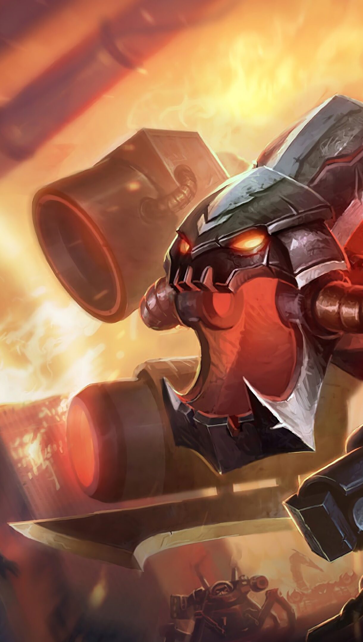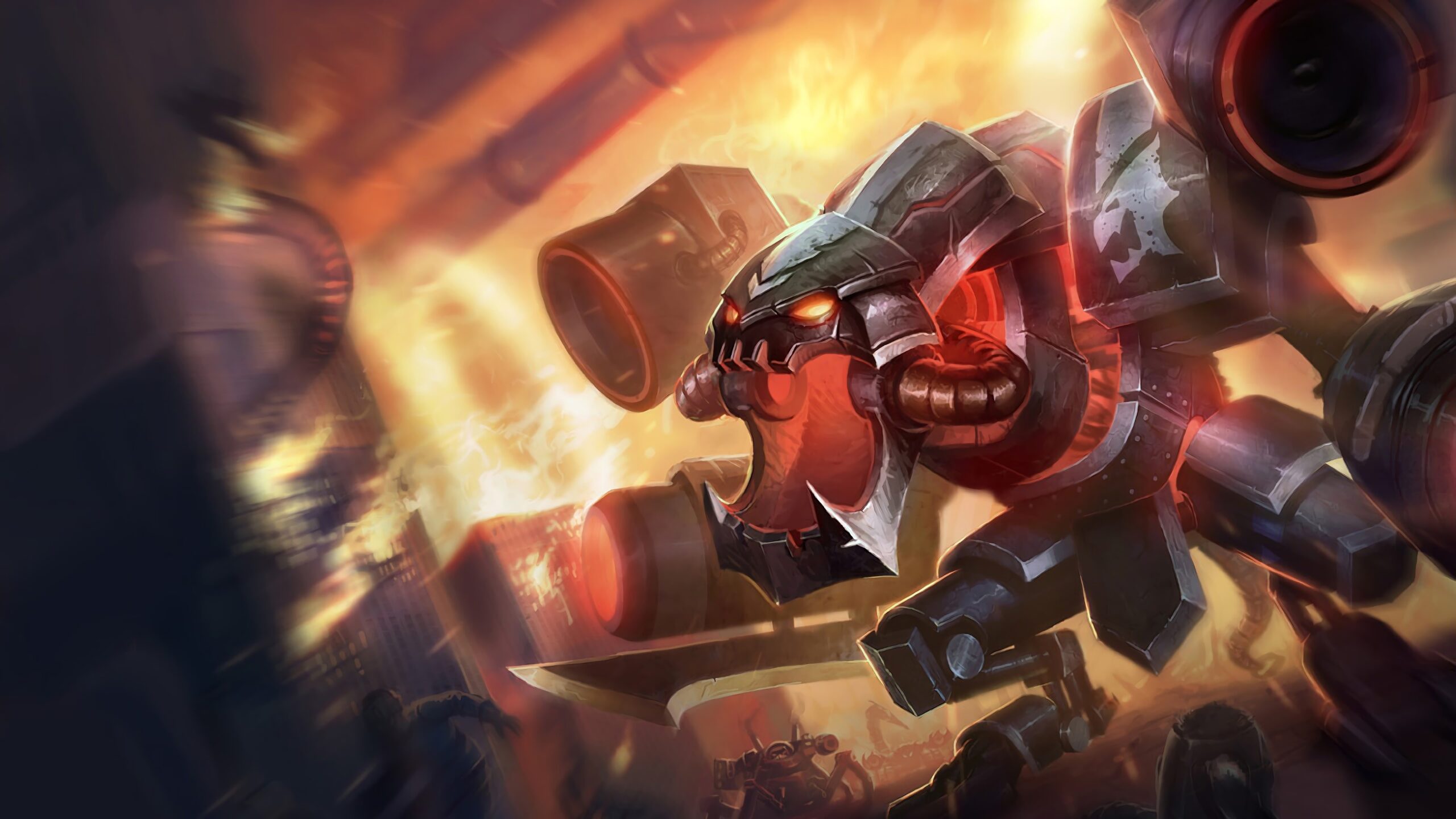 A captivating 4K wallpaper featuring the Battlecast Cho'Gath skin from League of Legends. Cho'Gath, a fearsome Void creature, is depicted in his Battlecast form with mechanical enhancements and a menacing presence. Simply click the download button to bring this masterpiece to life on your screen as a desktop wallpaper or save it for later in your picture collection.