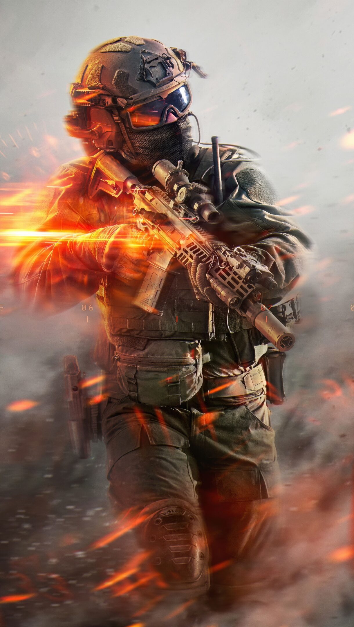 A dynamic 4K wallpaper showcasing a fully geared Battlefield 6 Assault Soldier advancing through a smoke-filled combat zone. Intense orange and red light bursts illuminate the soldier and their rifle, set against a backdrop of dust and a prominent fiery A logo, conveying a powerful and action-packed battle atmosphere.