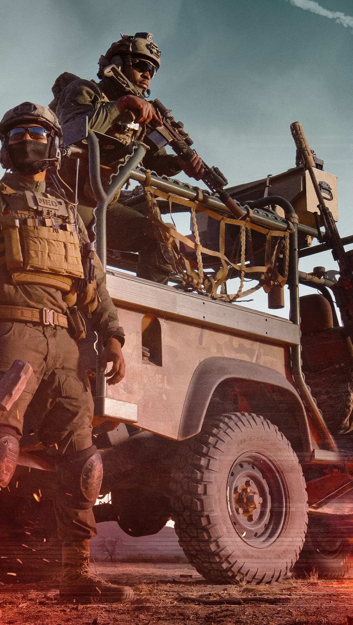 A dynamic 4K wallpaper showcases heavily armed military operatives and their rugged vehicle in a vast desert landscape, with ancient pyramids looming in the background. Fiery explosions and smoke engulf the foreground as combat helicopters sweep across the sky, setting a tense, action-packed mood for the Battlefield 6 official art.