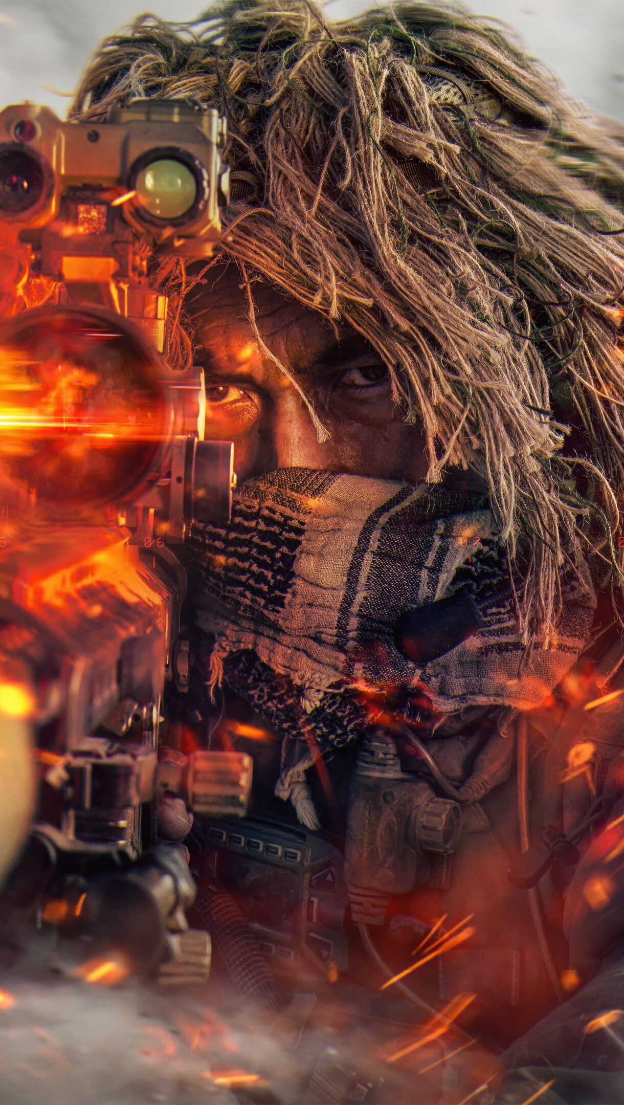 An intense 4K wallpaper depicts a focused Battlefield 6 Recon Sniper in a Ghillie suit, aiming a rifle amidst a chaotic, smoke-filled battle. Fiery orange and red explosions illuminate the scene, casting a dramatic glow on the sniper's determined eye and highlighting the HD detail of their camouflage against the hazy battlefield chaos.