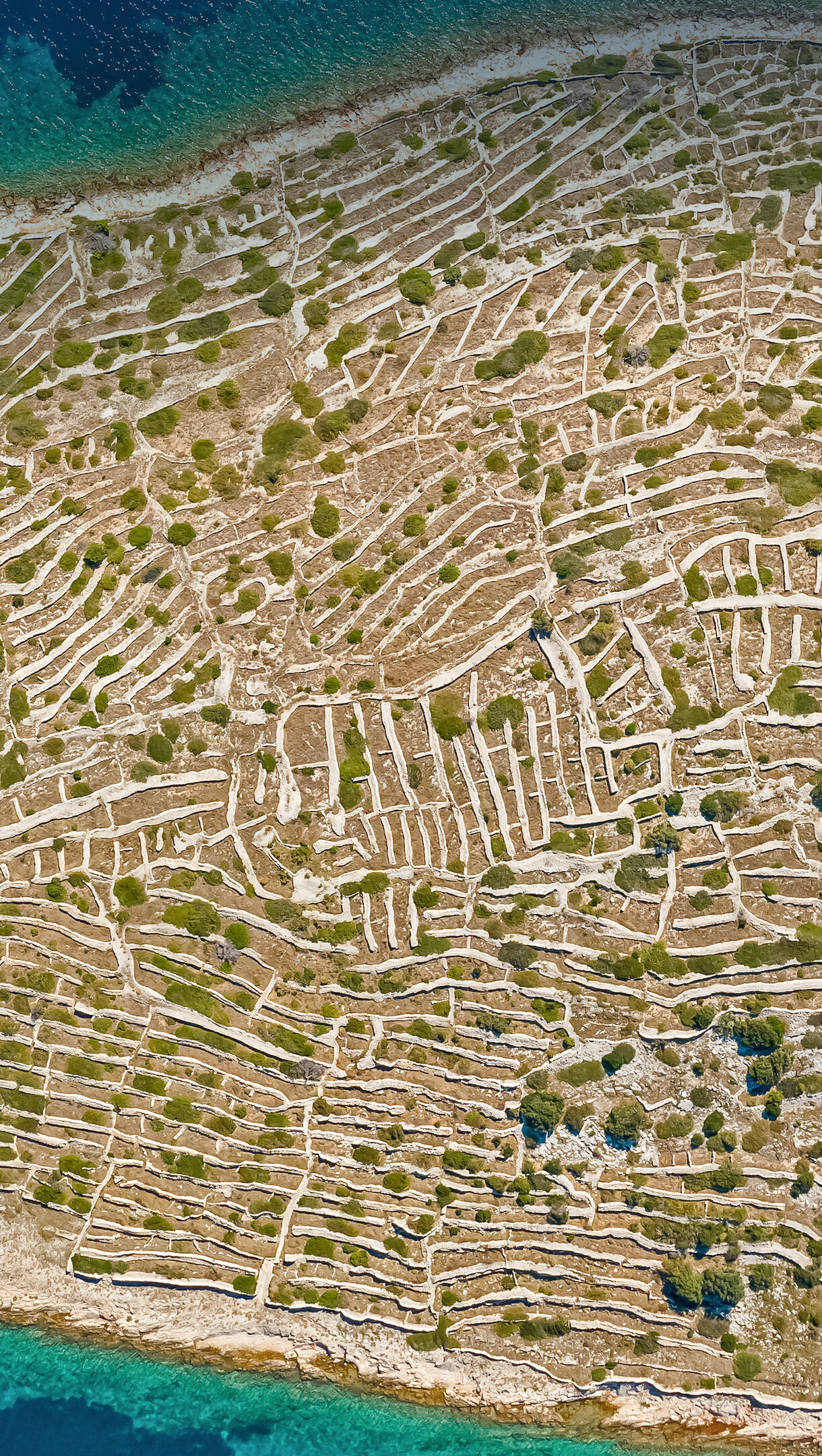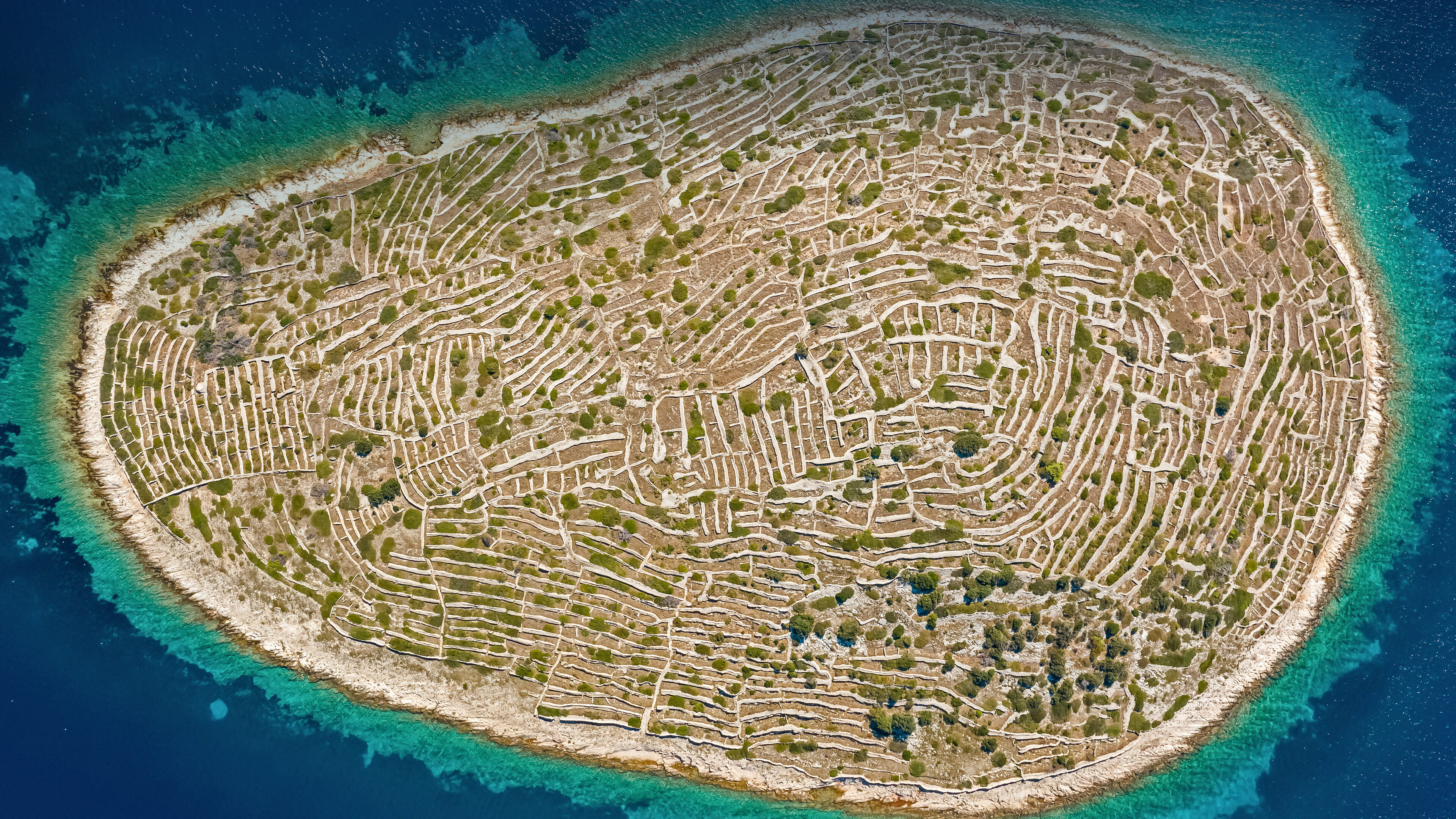 A mesmerizing 4K wallpaper showcasing Bavljenac Island, Croatia, from an aerial perspective, with its surface entirely covered by intricate dry stone walls. These ancient walls form a striking fingerprint-like pattern, contrasting with patches of green vegetation and surrounded by the deep turquoise and blue waters of the Adriatic Sea.
