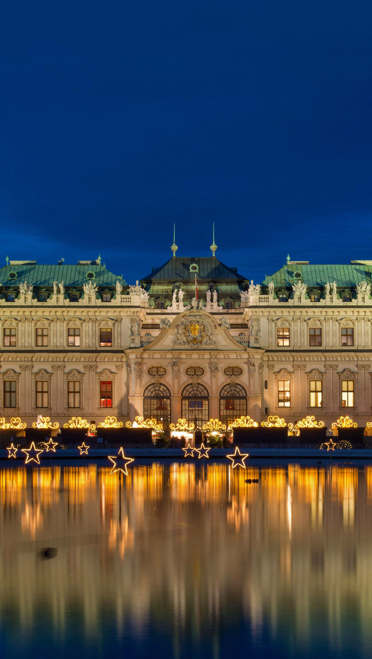 A magical 4K wallpaper showcasing the illuminated Belvedere Palace at night, set against the enchanting backdrop of its Vienna Christmas Market. Its festive lights, along with glowing star decorations, create a breathtaking, vibrant reflection on the calm water, capturing a serene holiday atmosphere.