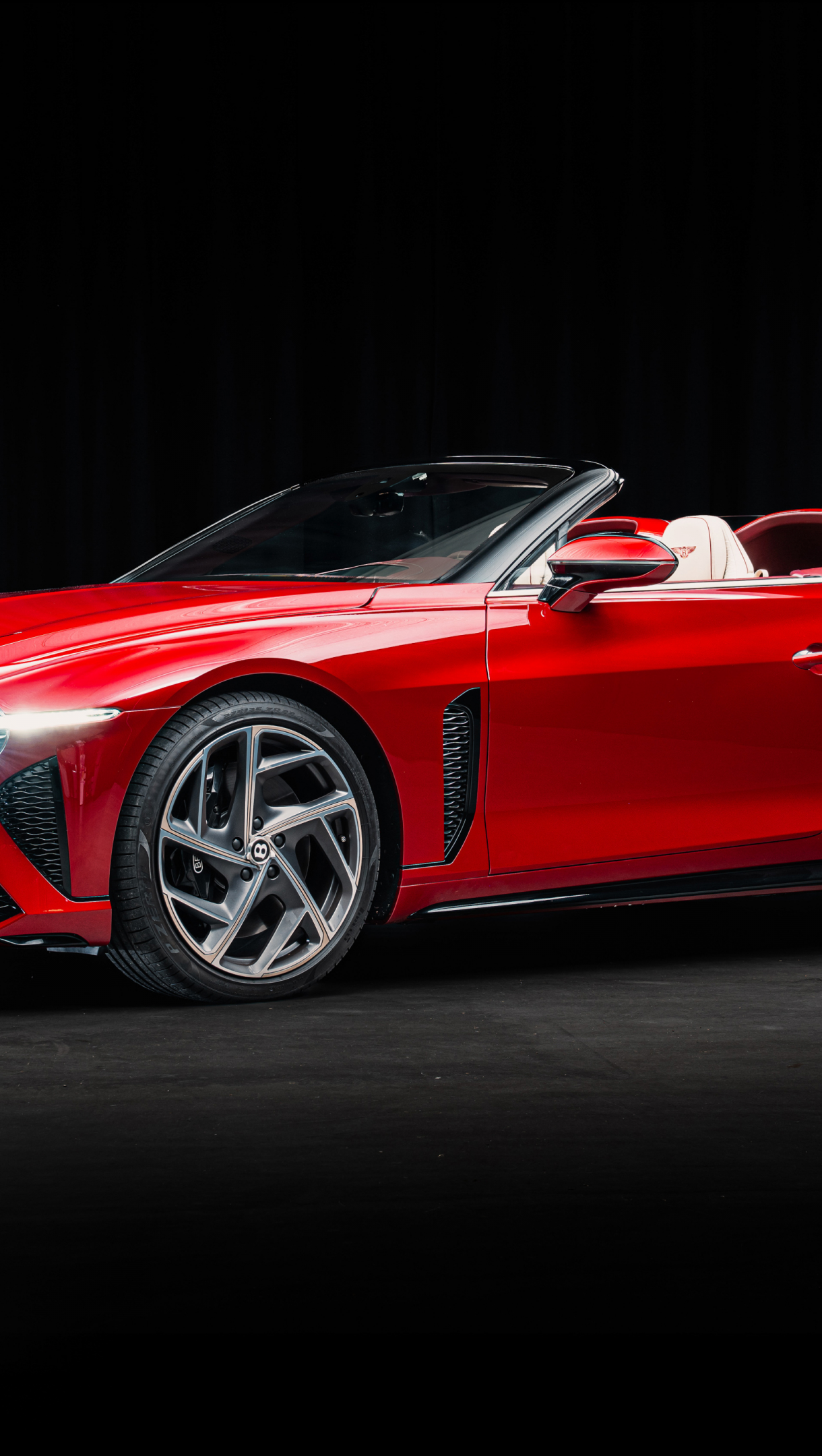 A luxurious 4K wallpaper highlights a brilliant red Bentley Mulliner Bacalar convertible parked against a deep dark background. Its sleek design and glowing headlights are accentuated by the stark contrast, creating a powerful and sophisticated visual.