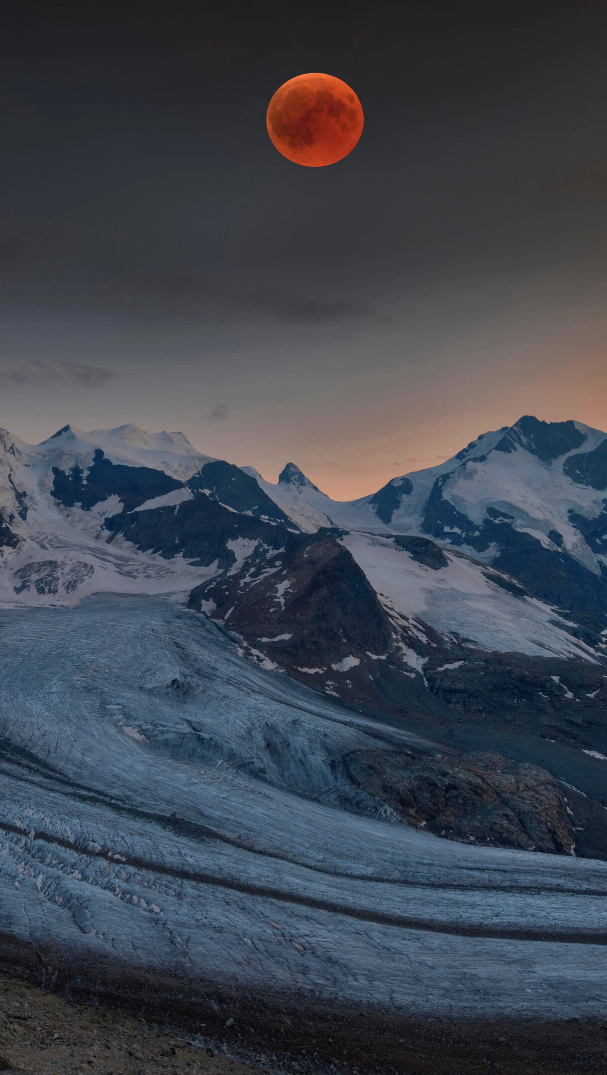 A dramatic 4K wallpaper presenting a panoramic view of the Bernina Range glacier winding through snow-capped peaks. The scene is powerfully highlighted by a vivid red Blood Moon hanging in a twilight sky, fading from dark charcoal to a warm, fiery orange over the mountainous horizon.