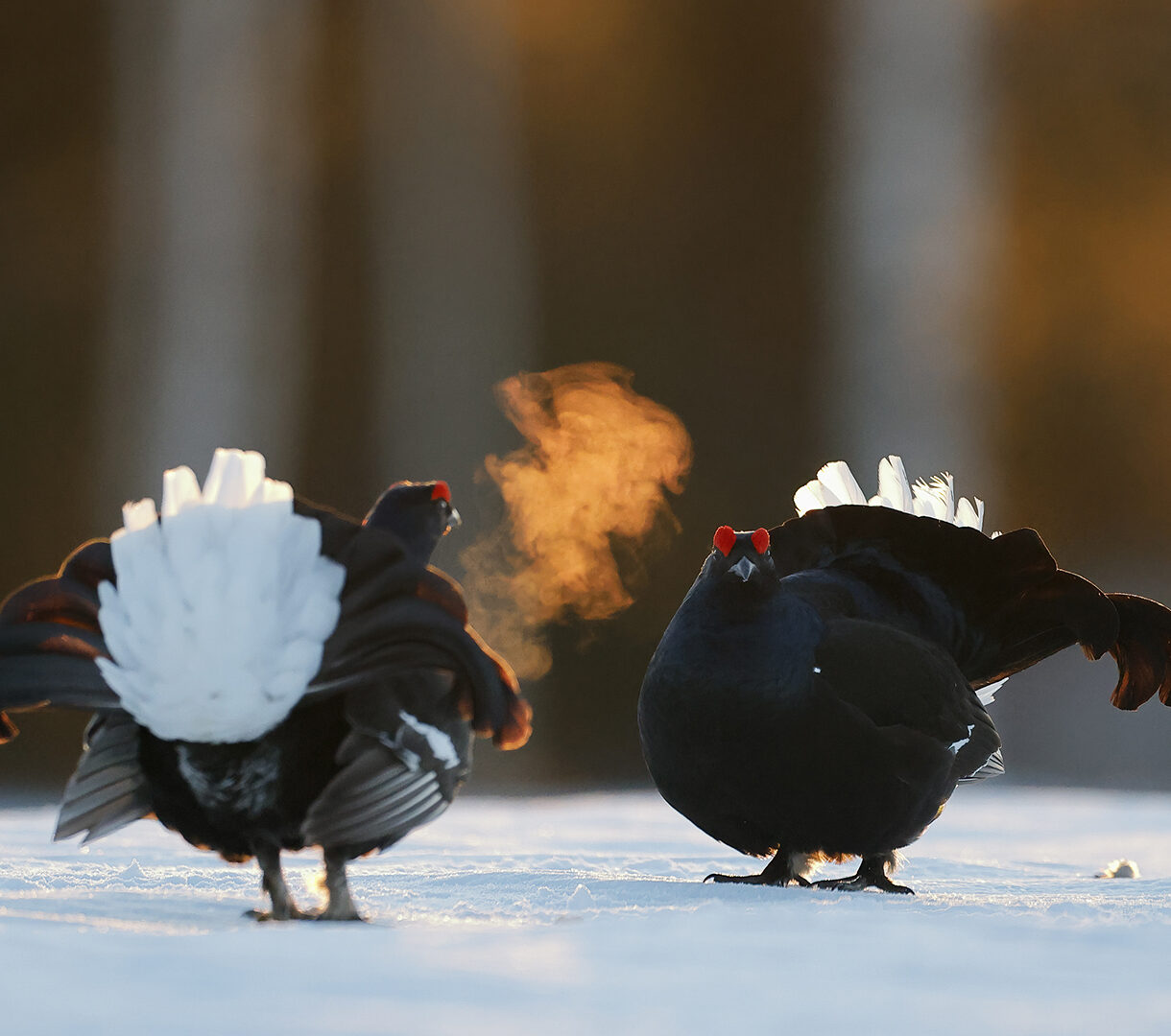A captivating 4K wallpaper showcasing two Black Grouse males on a crisp winter snowfield in Kuusamo, Finland. One bird exhales a plume of golden breath into the frosty air, beautifully backlit by a warm, low sun that highlights their displaying white undertail feathers against the dark forest.