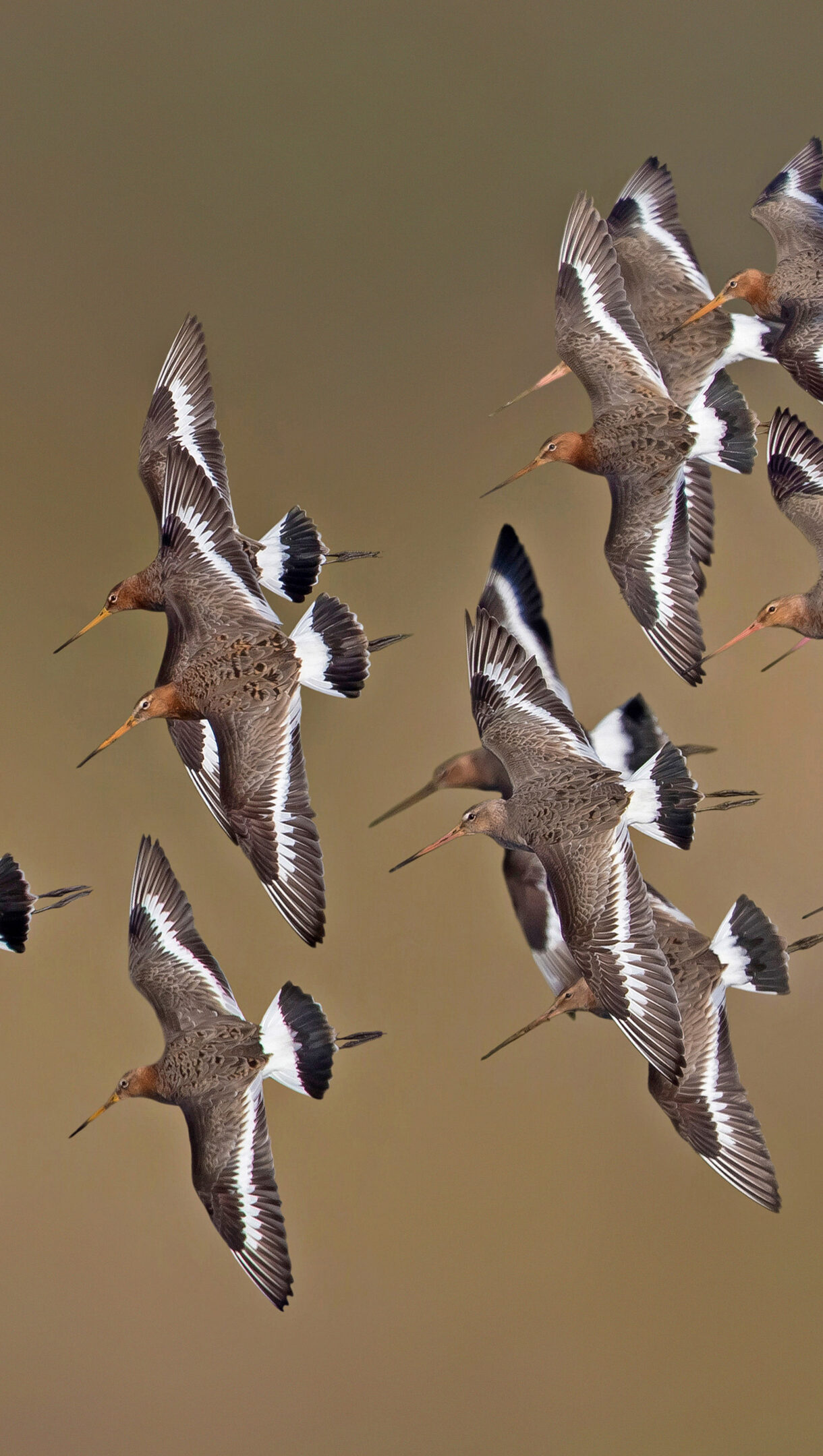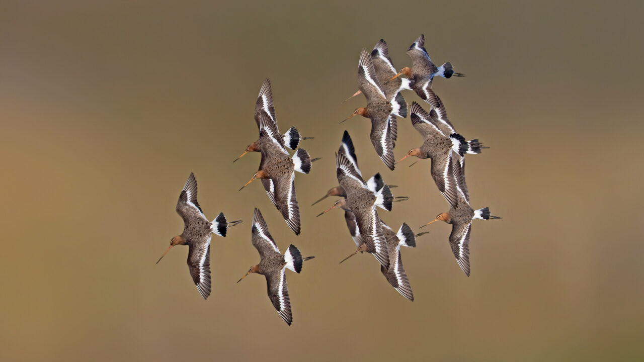 A dynamic 4K wallpaper showcasing a flock of Black-tailed Godwits in full flight over the Netherlands. The warm, earthy tones of the blurred background beautifully emphasize the crisp details of their outstretched wings and distinctive tail markings, highlighting their synchronized movement.