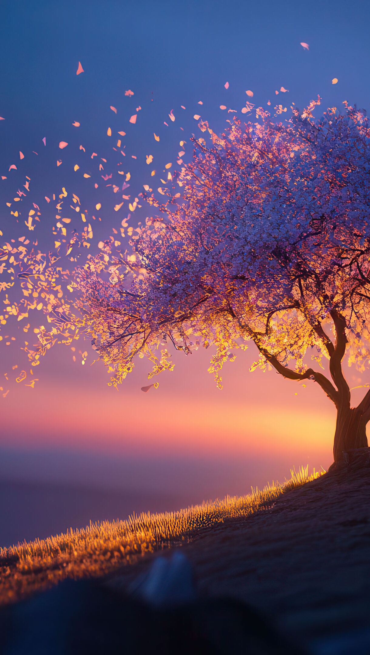 A breathtaking 4K wallpaper features a brightly blooming tree standing alone on a grassy hillside as the sun sets. Countless glowing pink petals are caught by the wind, scattering across the deep blue and orange sky in a beautiful, ethereal display.