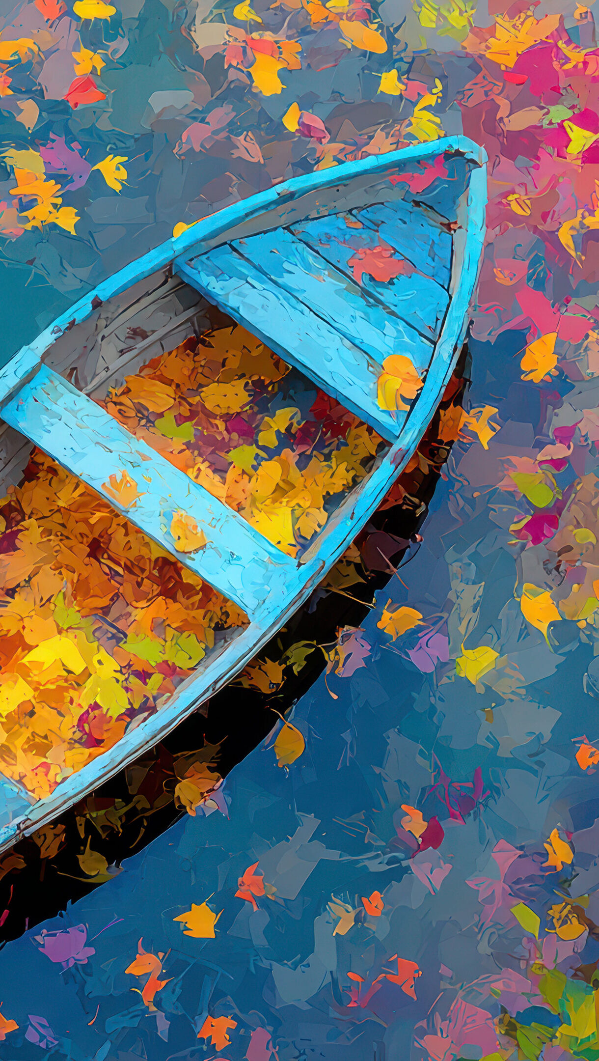 A mesmerizing 4K wallpaper featuring a weathered blue boat floating on serene water. The boat is partly filled and surrounded by a vibrant tapestry of colorful autumn leaves, reflecting the rich hues of the season.
