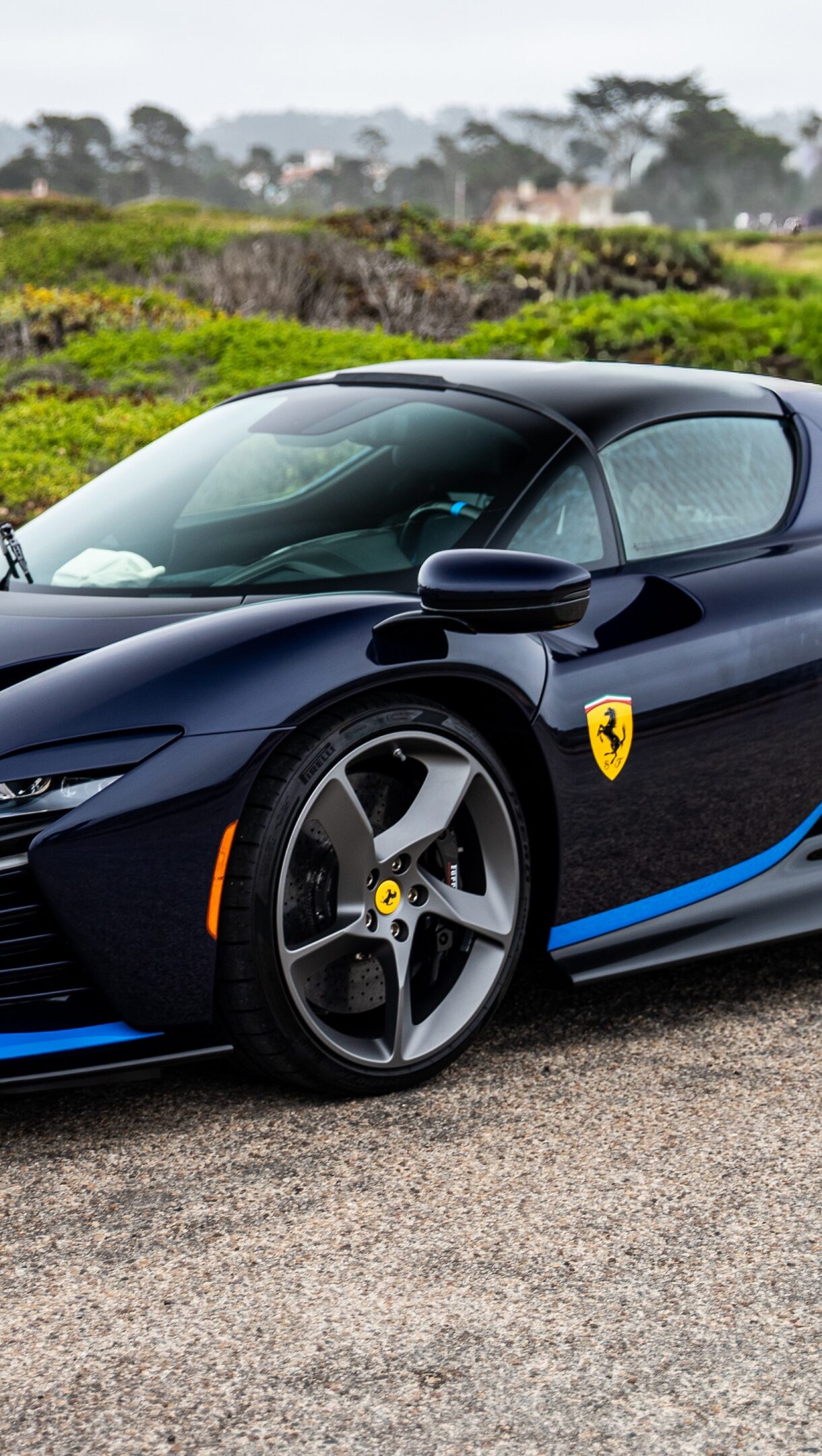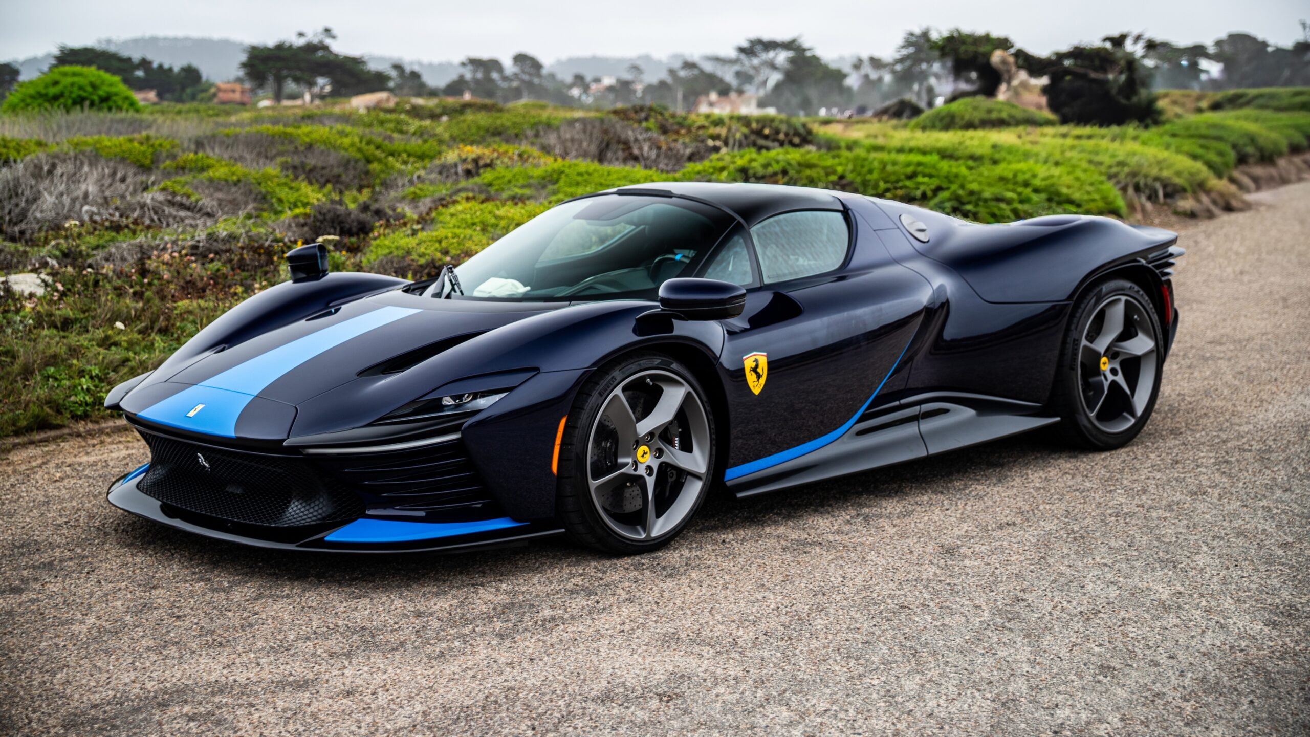 A striking 4K wallpaper showcasing a sleek blue Ferrari Daytona SP3 sports car parked on a textured gravel path amidst a verdant, natural landscape under an overcast sky. Its highly polished, dark blue body, accented by vibrant light blue racing stripes, gleams softly, conveying both luxury and untamed power against the muted greens of the backdrop.