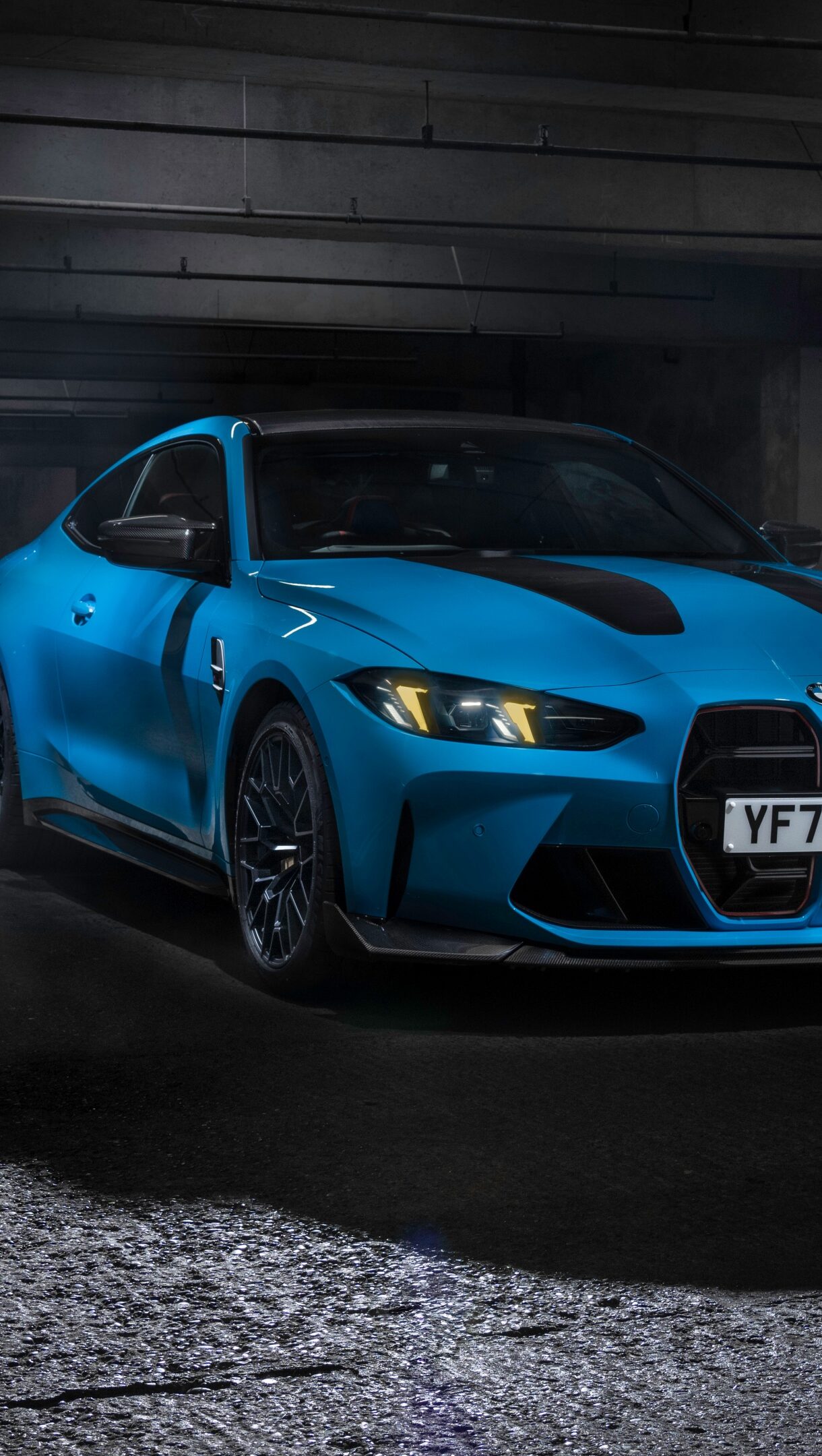 A sleek 4K wallpaper featuring the BMW M4 CS in a dark aesthetic. The high-performance sports car is showcased with moody lighting, emphasizing its aggressive design and dynamic presence.