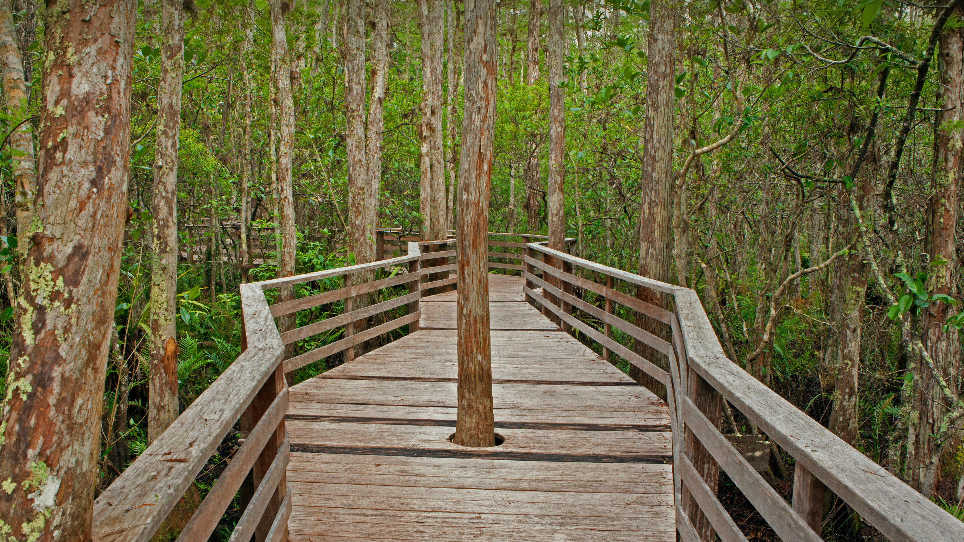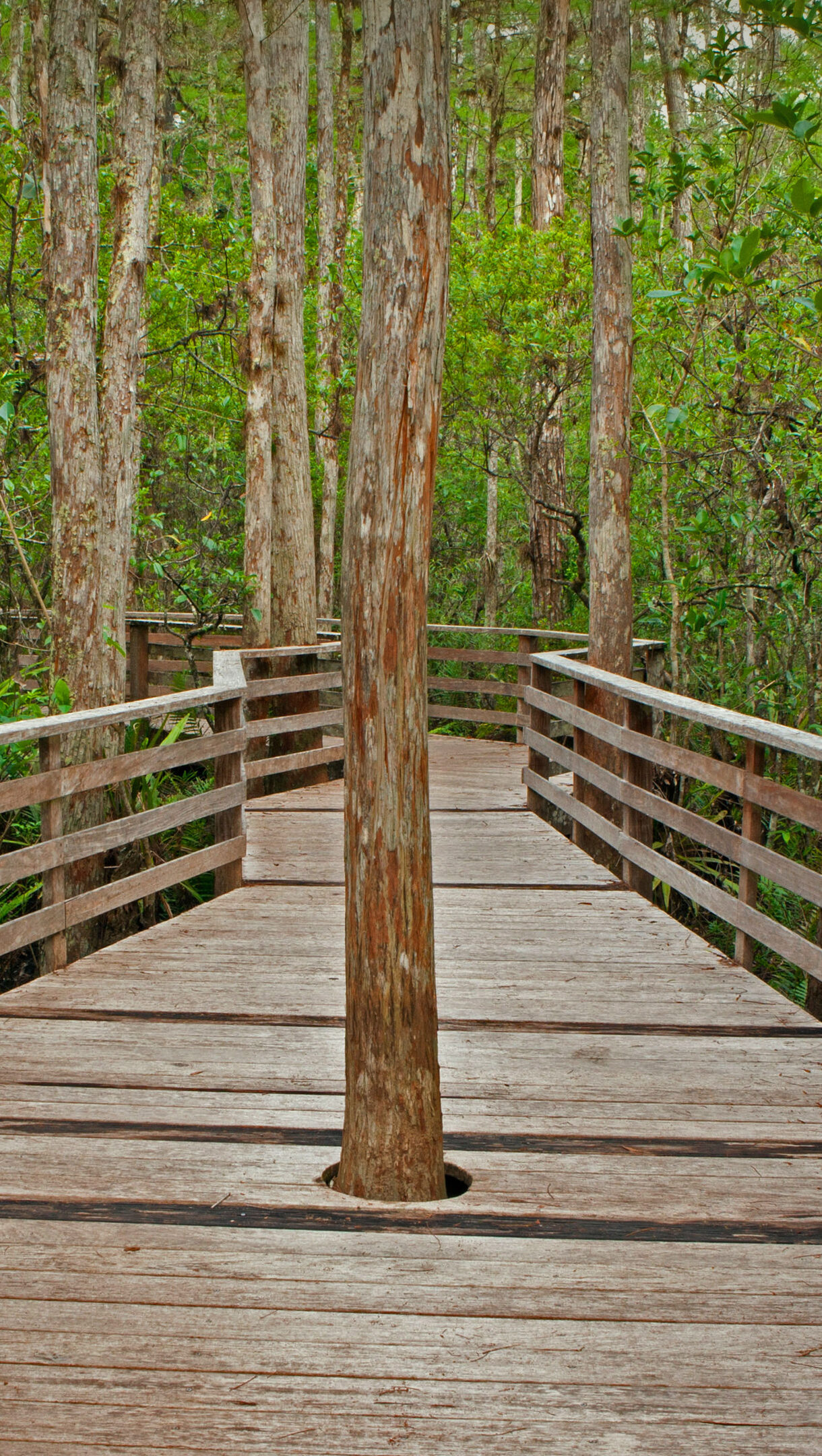 A captivating 4K wallpaper displays the winding wooden Boardwalk Trail through the lush, waterlogged cypress forest of Corkscrew Swamp Sanctuary in Florida. A prominent tree trunk grows directly through the center of the path, its weathered bark contrasting with the vivid green foliage, evoking a sense of tranquil immersion in nature.