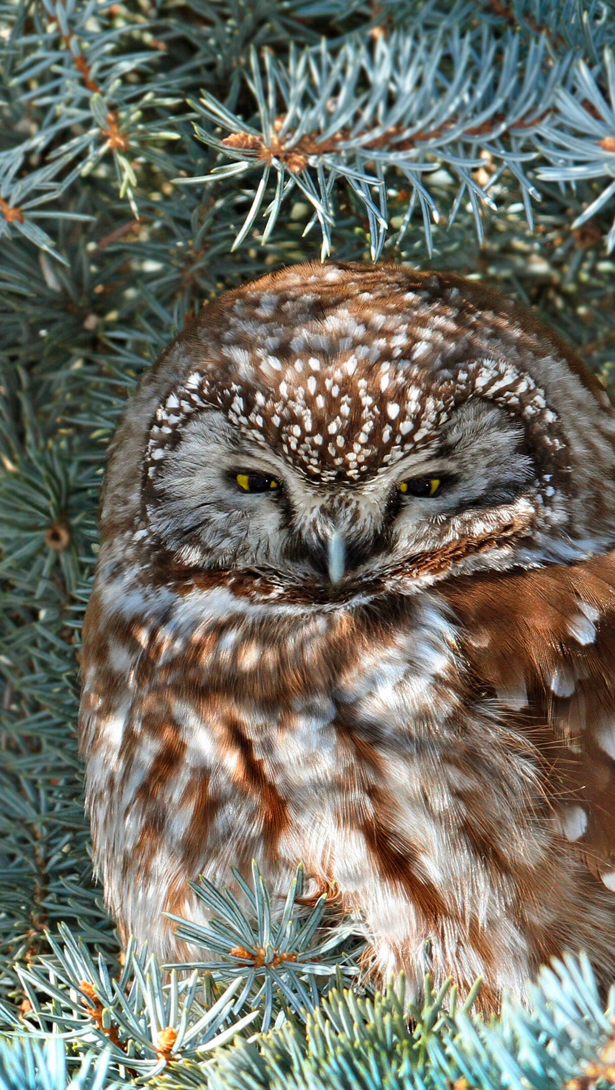 A serene 4K wallpaper presents a Boreal Owl perched quietly on a spruce tree in Saskatchewan, Canada. Its speckled brown and white plumage is exquisitely detailed against the vibrant blue-green needles, with warm light illuminating its focused yellow eyes.