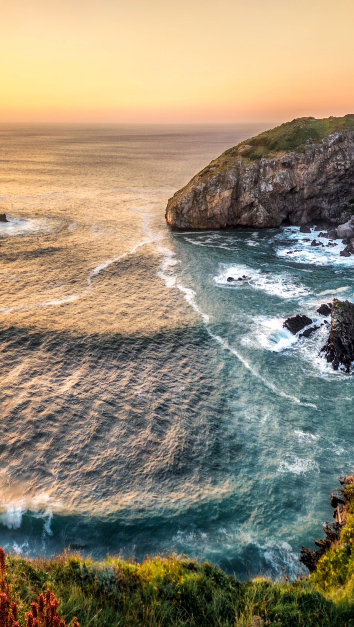 A breathtaking 4K wallpaper captures the iconic Gaztelugatxe island, with its winding stone path leading to a hermitage, set against the vast expanse of the Basque Coast. The scene is bathed in the warm, golden light of a dramatic sunset, casting a vibrant glow over the active waves crashing against the rocky shore.