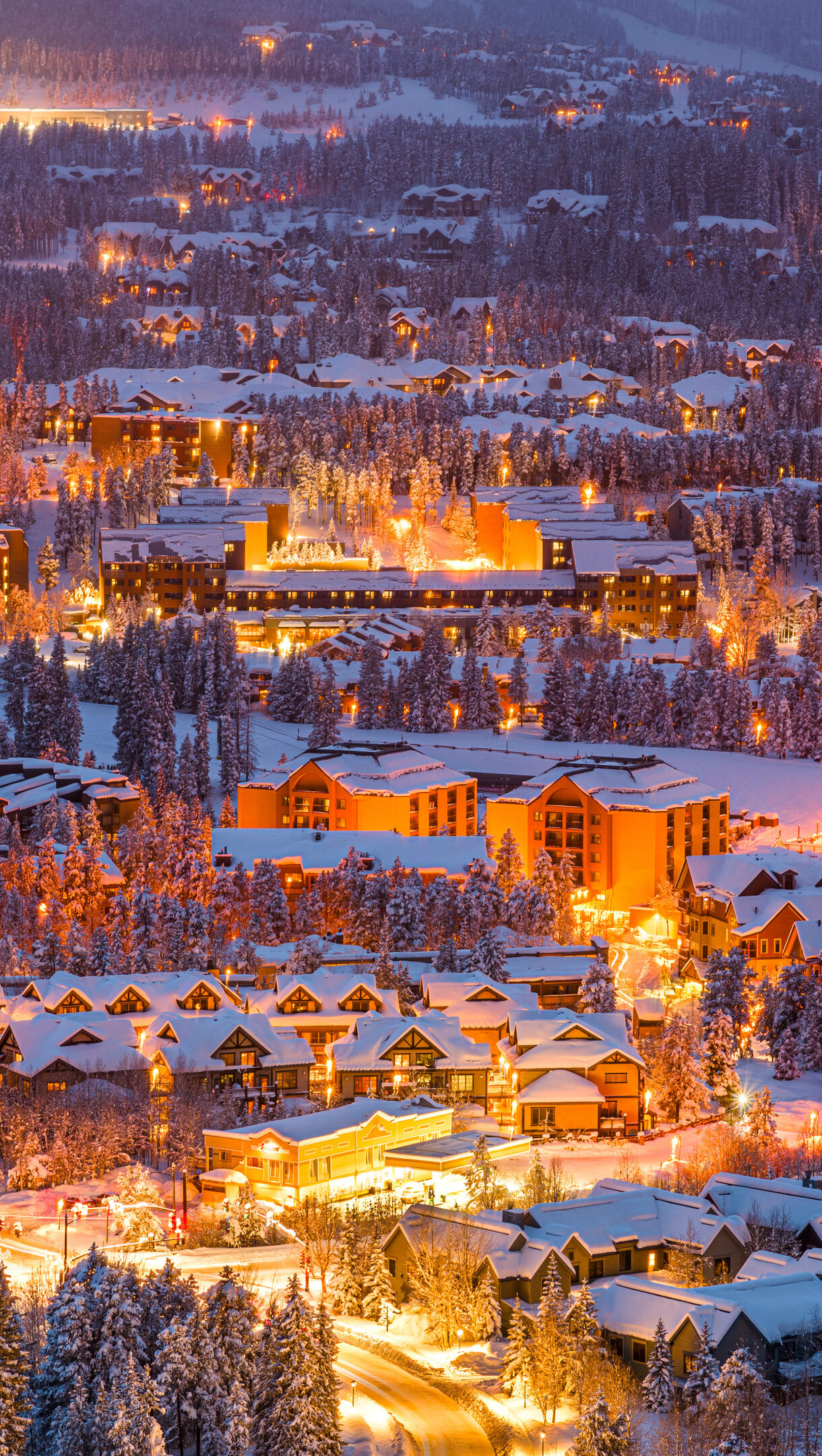 An enchanting 4K wallpaper of Breckenridge, Colorado, depicting a snow-covered town nestled among vast coniferous forests during a serene winter night. Warm, golden lights from numerous buildings and streets illuminate the pristine white snow, creating a cozy and magical contrast against the cool twilight sky and dark, snow-laden evergreen trees.