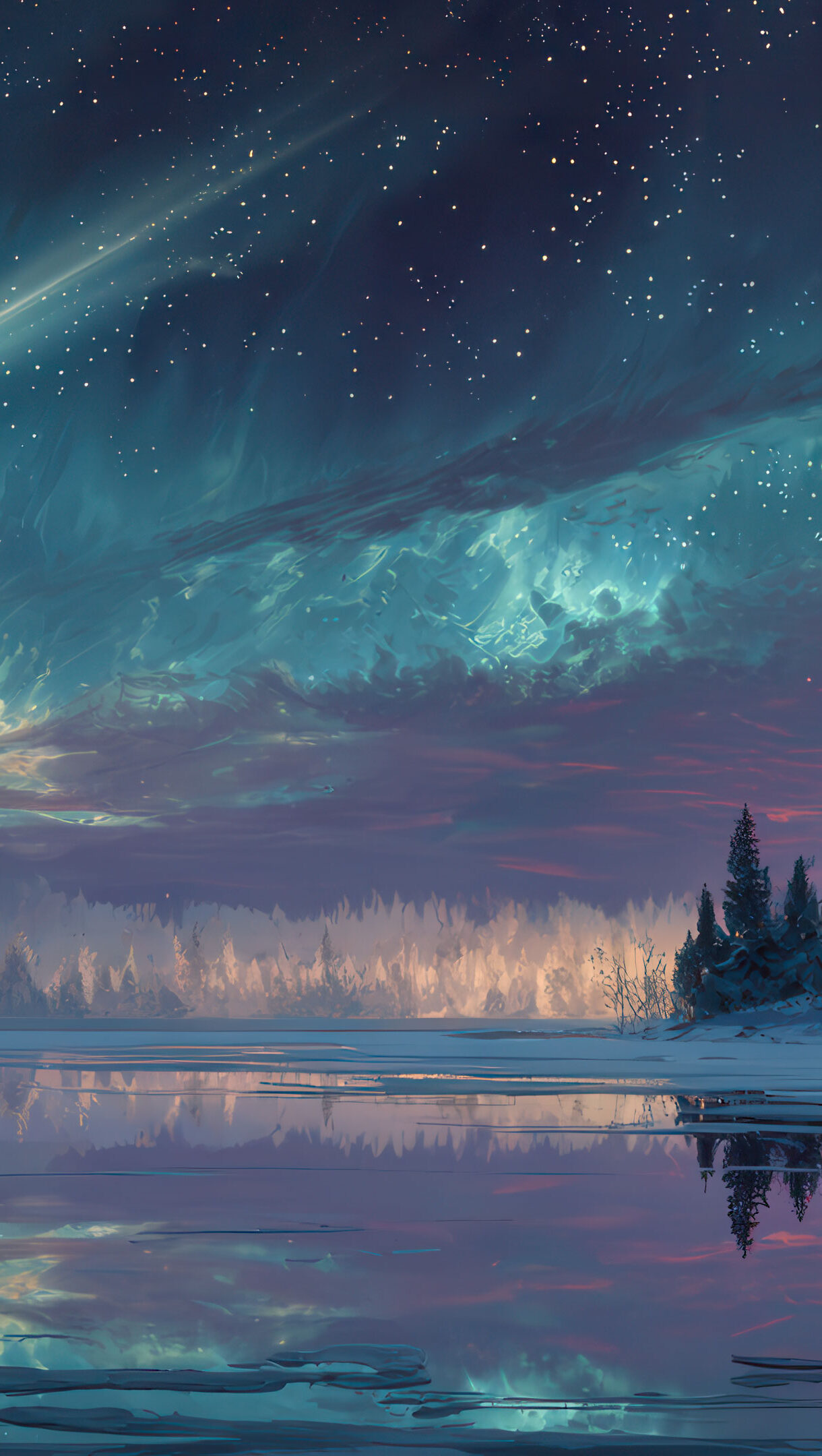 An ethereal 4K wallpaper capturing a brilliant meteor streaking across a vast, starry night sky over a frozen winter lake surrounded by snow-dusted evergreen trees. The vivid teal and purple aurora-like clouds in the sky and their shimmering reflections in the icy water create a magical, tranquil scene, accented by a warm glow on the distant horizon.
