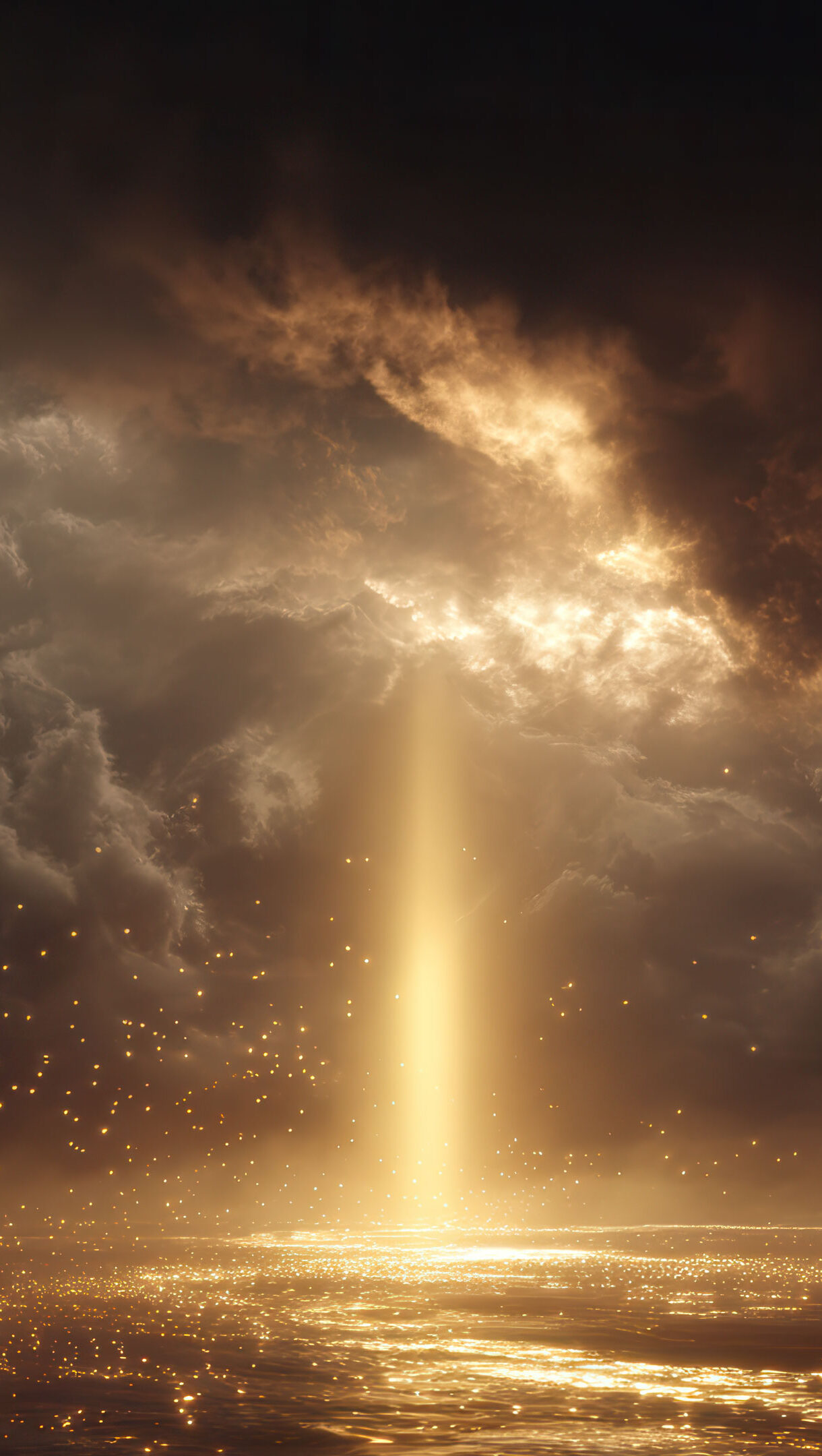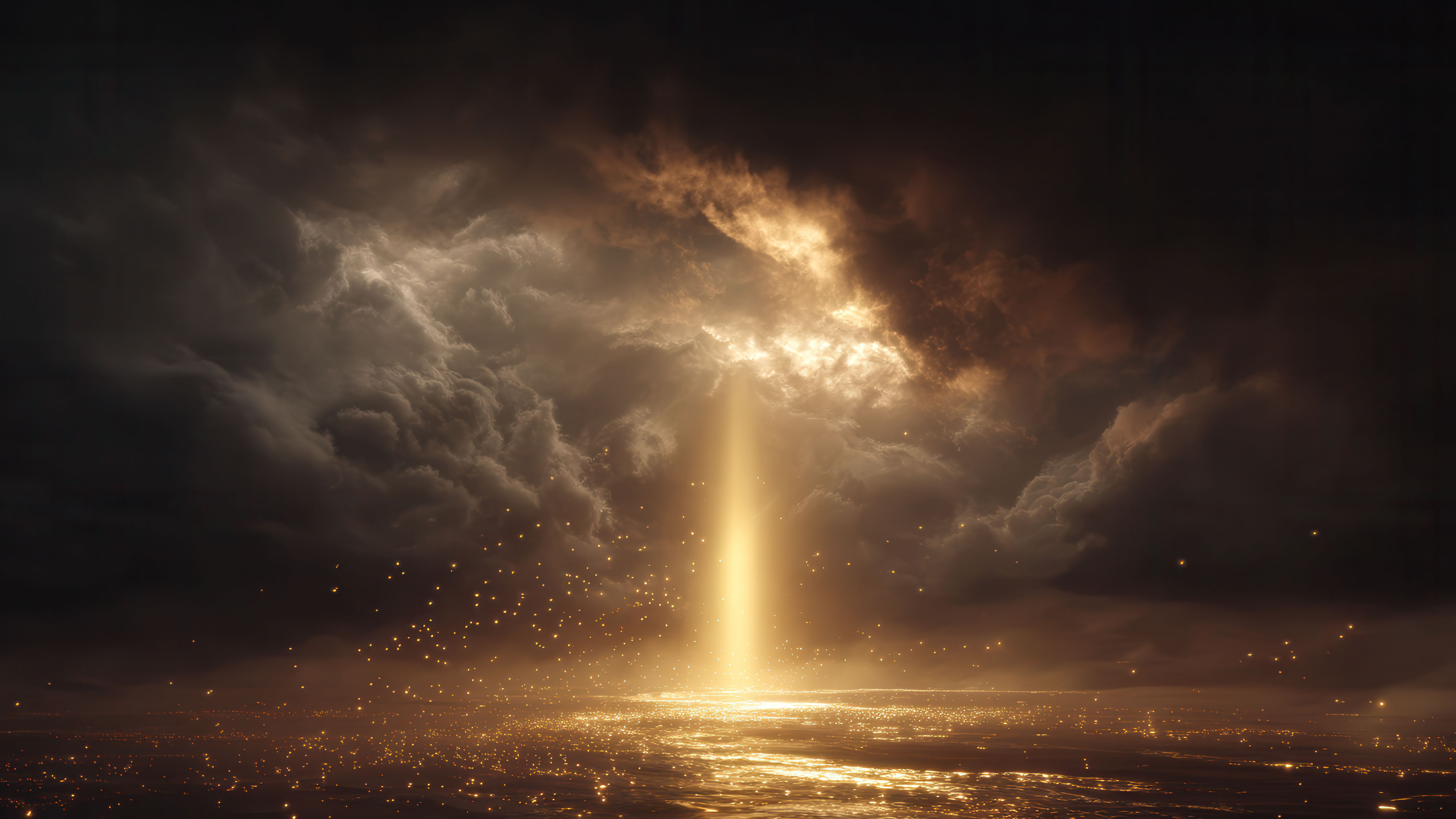 A captivating 4K wallpaper portrays a dramatic beam of golden light piercing through dark, turbulent clouds to illuminate a vast, shimmering expanse of water. This intense golden glow casts countless shimmering particles into the air and reflects brilliantly on the water's surface, creating a powerful, ethereal, and hopeful atmosphere.