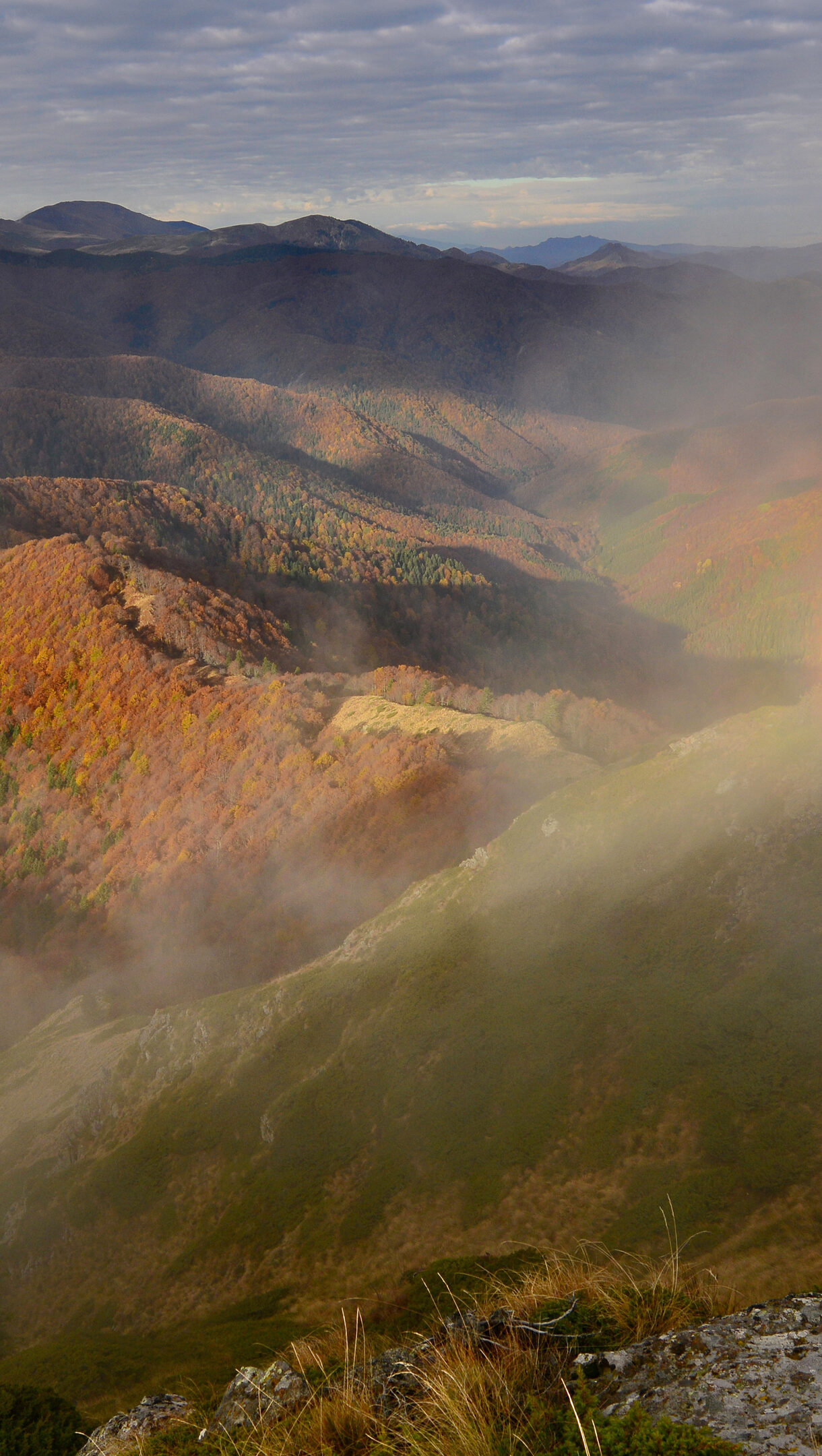 A breathtaking 4K wallpaper showcases a magnificent Brocken Spectre appearing over the vibrant autumn mountains of Central Balkan National Park, Bulgaria. The spectral silhouette, encircled by a radiant rainbow halo, dramatically emerges from the swirling mist, bathing the richly colored autumn slopes in an ethereal glow.